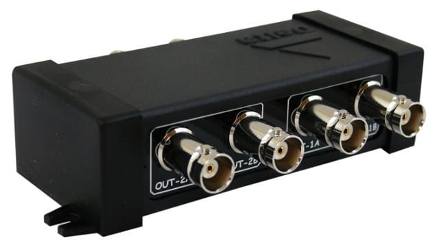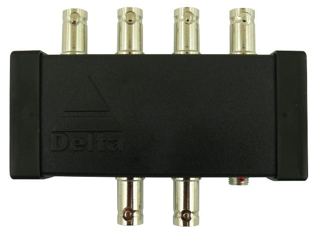 RV-2/4P video splitter allows video signals to be separatedThe device is adapted for continuous operation, indoorsA device adapted to color, black and white cameras, PALOasely distance between sockets, allow free finger tightening of any BNC plug
