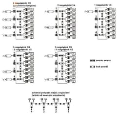 By default, the RV-4/8PR is set as 4 independent 1/2 video splitters. It is very easy to reconfigure it using jumpers, which are available after removing the cover. There are 5 combinations available, which are presented below. Vertical jumpers activate individual inputs, while horizontal jumpers connect the outputsit is very easy to reprogram it using jumpers located on the front panel. Number of combinations:5. Examples of four of them are visible in the drawings. When programming, use the table. Vertical jumpers activate individual entrances, while horizontal jumpers connect the exits
