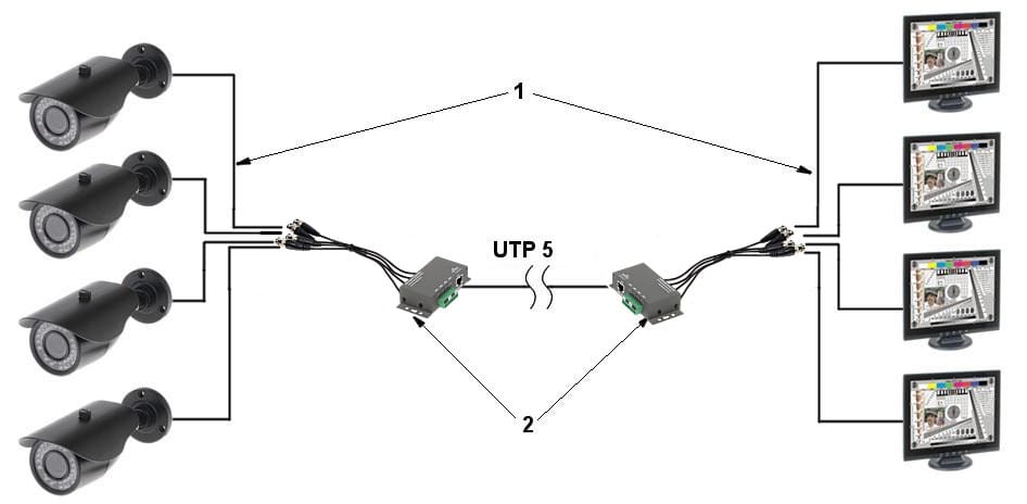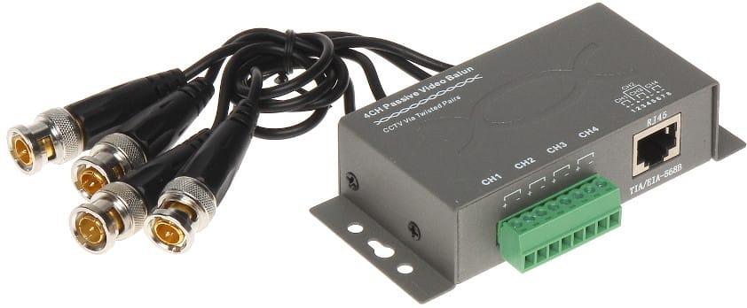 TR-4M is designed for video signal transmission via twisted pair cableThe device adjusts the impedance of a 75Ω coaxial cable to the impedance of a symmetrical cable, ensuring video signal transmission up to 400m (twisted pair cable of 5 categories) and eliminates asymmetric interference