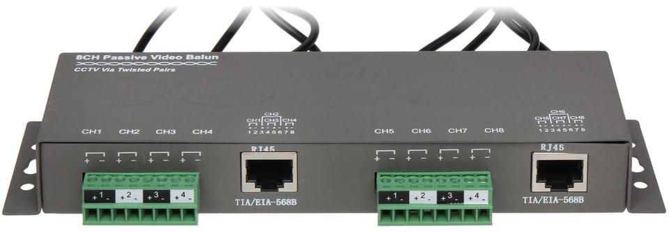 TR-8M is designed for video signal transmission via twisted pair cableThe device adjusts the impedance of a 75Ω coaxial cable to the impedance of a symmetrical cable, providing video signal transmission up to 400m (twisted pair cable of 5 categories) and eliminates asymmetrical interference