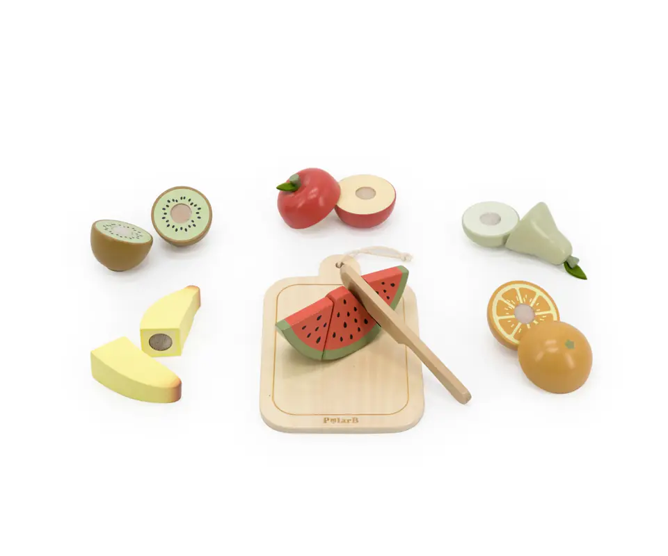 Zestaw do krojenia na desce- owoce dla kucharzy spodoba się chłopcom i dziewczętom w wieku przedszkolnym. Drewniane owoce pozwalają urozmaicić gry fabularne, uzupełnić zabawkowe kuchnie, nauczyć się przyrządzania prostych potraw.