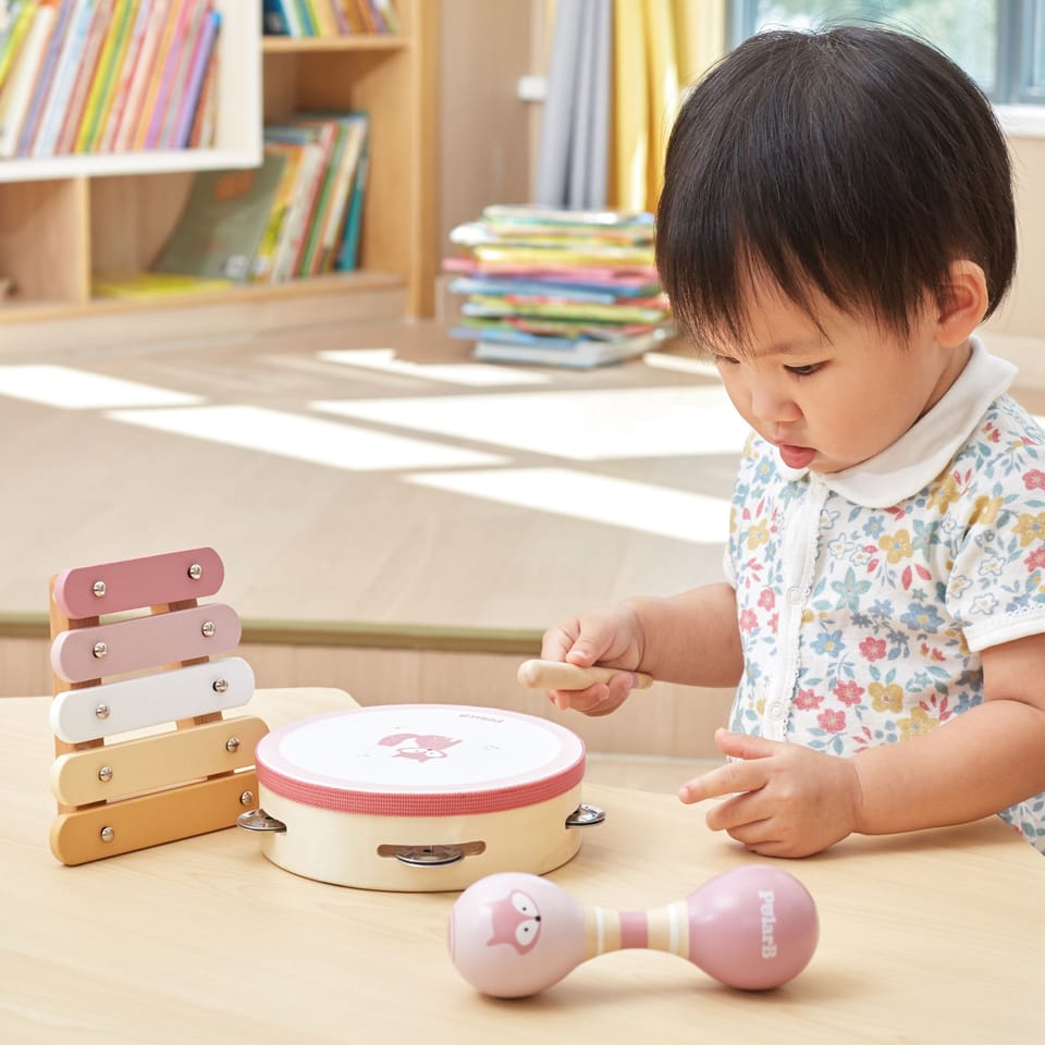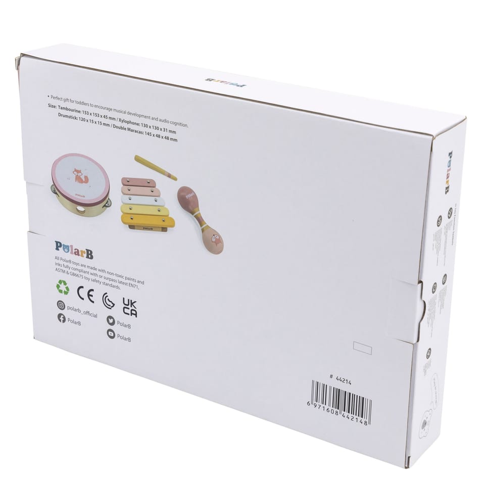 Przedstawiamy drewnianą zabawkę marki VIGA – zestaw instrumentów muzycznych z serii PolarB. Jest idealny dla dzieci od 12 miesiąca życia, dzięki różnorodności elementów wspiera rozwój słuchowy jak i ruchowy. W skład zestawu zalicza się tamburyn, podwójne marakasy i ksylofon z pałeczką perkusyjną. Zabawka pozwala na zapoznanie się z różnorodnością dźwięków oraz układanie pierwszych kompozycji. Zestaw daje możliwość jednoczesnej zabawy kilkorga dzieci ucząc współpracy w grupie. Nie tylko dostarcza rozrywki, ale także może wprowadzać w fascynujący świat dźwięków i muzyki, rozwijając ich zainteresowanie tym obszarem oraz umiejętności kreatywne i poznawcze.Całość wykonana została z drewna bukowego i pomalowana nietoksycznymi farbami o stonowanych barwach, które przyciągną wzrok oraz zachęcą do zabawy dając jednocześnie mnóstwo radości. Farby są w 100% bezpieczne, spełniają normy bezpieczeństwa EN71 i ASTM.Zestaw jest estetycznie zapakowany w kolorowe kartonowe pudełko, w sam raz na prezent.Zabawka przeznaczona dla maluchów powyżej 12. miesiąca życia. Cała seria zabawek PolarB została stworzona przez firmę VIGA aby sprostać oczekiwaniom rodziców i dzieci w doskonaleniu procesu ich rozwoju poprzez zabawę.Wymiar produktu:Tamburynek- dł. 153 mm x wys. 45 mm x szer. 153 mmXylofon- dł. 130 mm x wys. 31 mm x szer. 130 mmMarakasy- dł. 145 mm x wys. 48 mm x szer. 48 mmPałeczka- dł. 120 mm x wys. 15 mm x szer. 15 mmWymiary opakowania: Dł. 360 mm x wys. 60 mm x szer. 225 mmWaga brutto: 0,6 kgOpisy