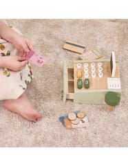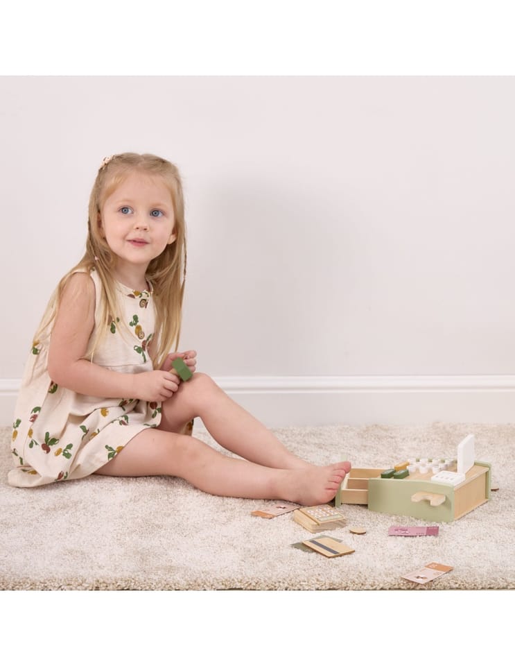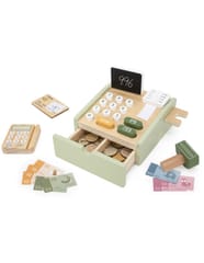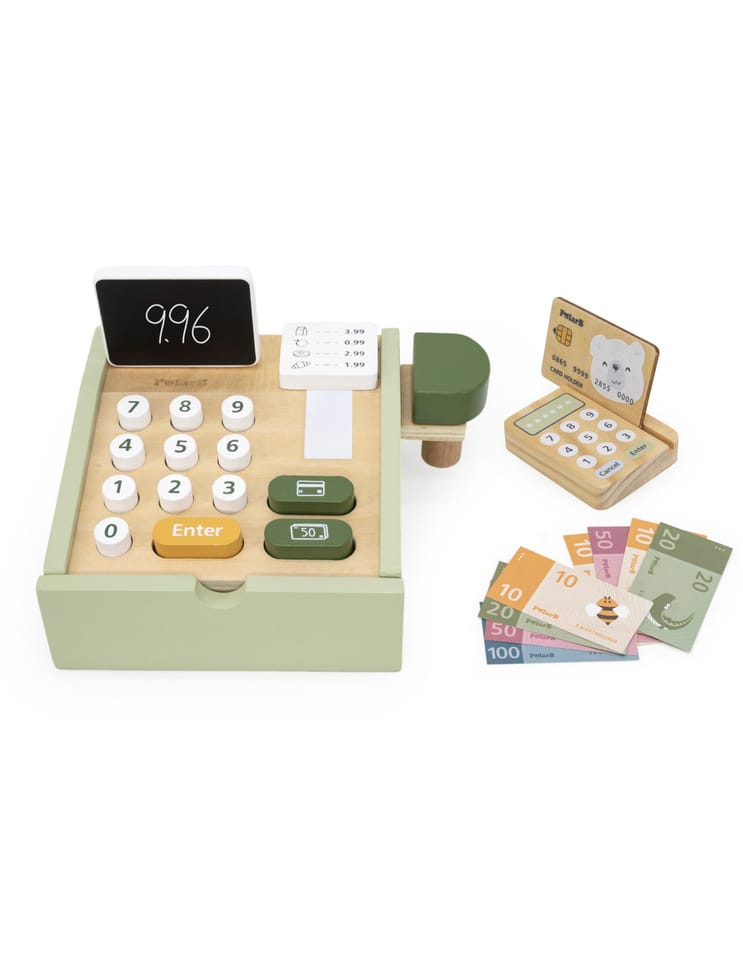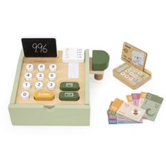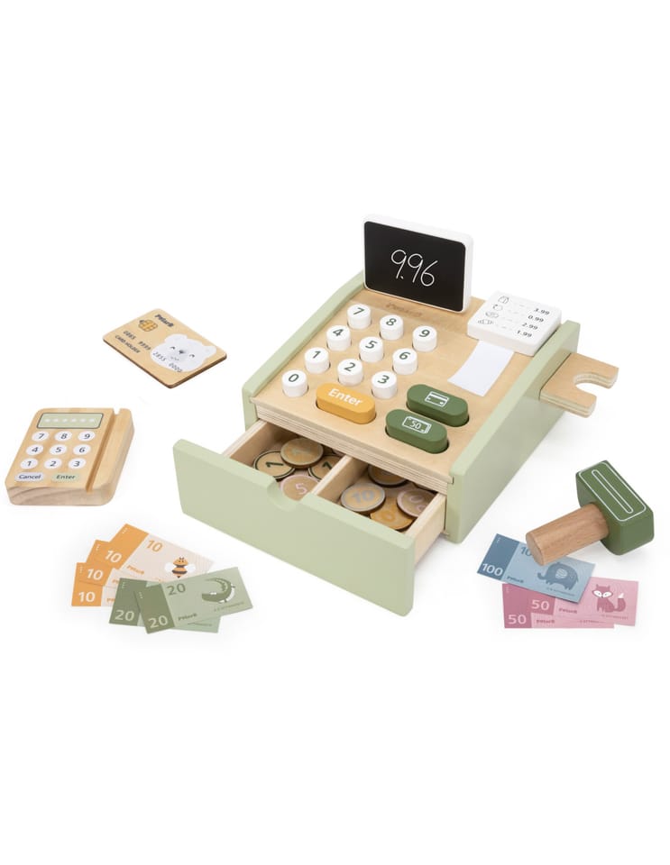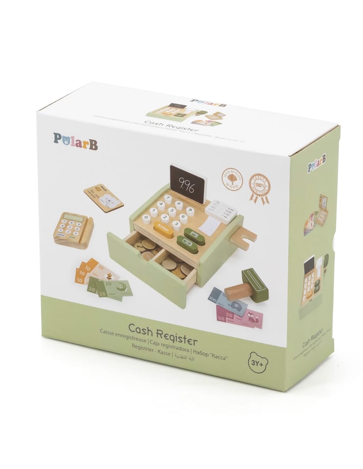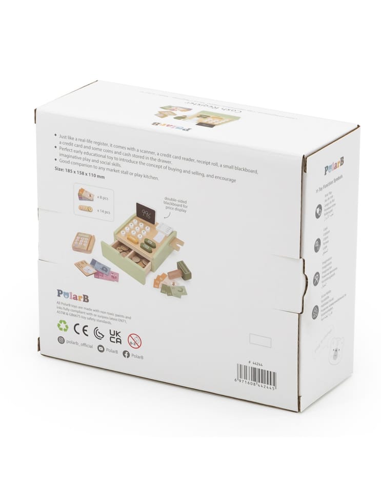 Kasa sklepowa od firmy Viga to idealny prezent, który ucieszy każde dziecko. Zabawa w sklep – któż z nas się w nią nie bawił… Drewniana kasa sklepowa wprowadzi Twoje dziecko w ekscytującą zabawę jako kasjer lub sprzedawca w supermarkecie, sklepie z odzieżą, czy też kwiaciarni. Rozwija wyobraźnię i fantazję, wspomaga naukę liczenia, jak posługiwać się pieniędzmi oraz wzbogaci umiejętności społeczne. Sprzęt pomoże rozwinąć u dziecka logiczne myślenie i zdolności manualne. Dodatkowo pomoże zrozumieć wartość pieniądza i podstawy matematyki.Zestaw zawiera:- skaner kodów produktów- wyświetlacz cen- klawiatura z cyframi 0-9- 3 przyciski: otwarcie/ karta/ gotówka- plansza z cenami 4 produktów- wysuwana szuflada z 2 przegródkami na monety i banknoty- czytnik kart płatniczych- 1 kartę kredytową- 10 monet- 8 banknotówCałość wykonana została z drewna bukowego i pomalowana nietoksycznymi farbami w barwy, które zadowolą każdego użytkownika i dadzą mnóstwo radości z zabawy.Dzięki estetycznemu opakowaniu zabawka jest idealna na prezent!Naszym priorytetem jest bezpieczeństwo dzieci oraz najwyższa jakość zabawek, dbamy zatem o to, aby farby którymi malujemy nasze zabawki nie były toksyczne i spełniały normy bezpieczeństwa (EN71 i ASTM).Zabawka przeznaczona dla dzieci powyżej 36 miesiąca życia.Wymiar produktu:Dł. 160mm x wys. 110 mm x szer. 195 mmWaga netto: 0,51 kgWymiary opakowania:Dł. 195 mm x wys. 75 mm x szer. 165 mmWaga brutto: 0,6 kgOpisy