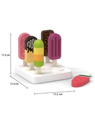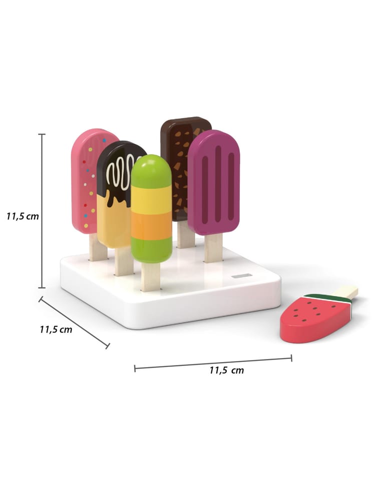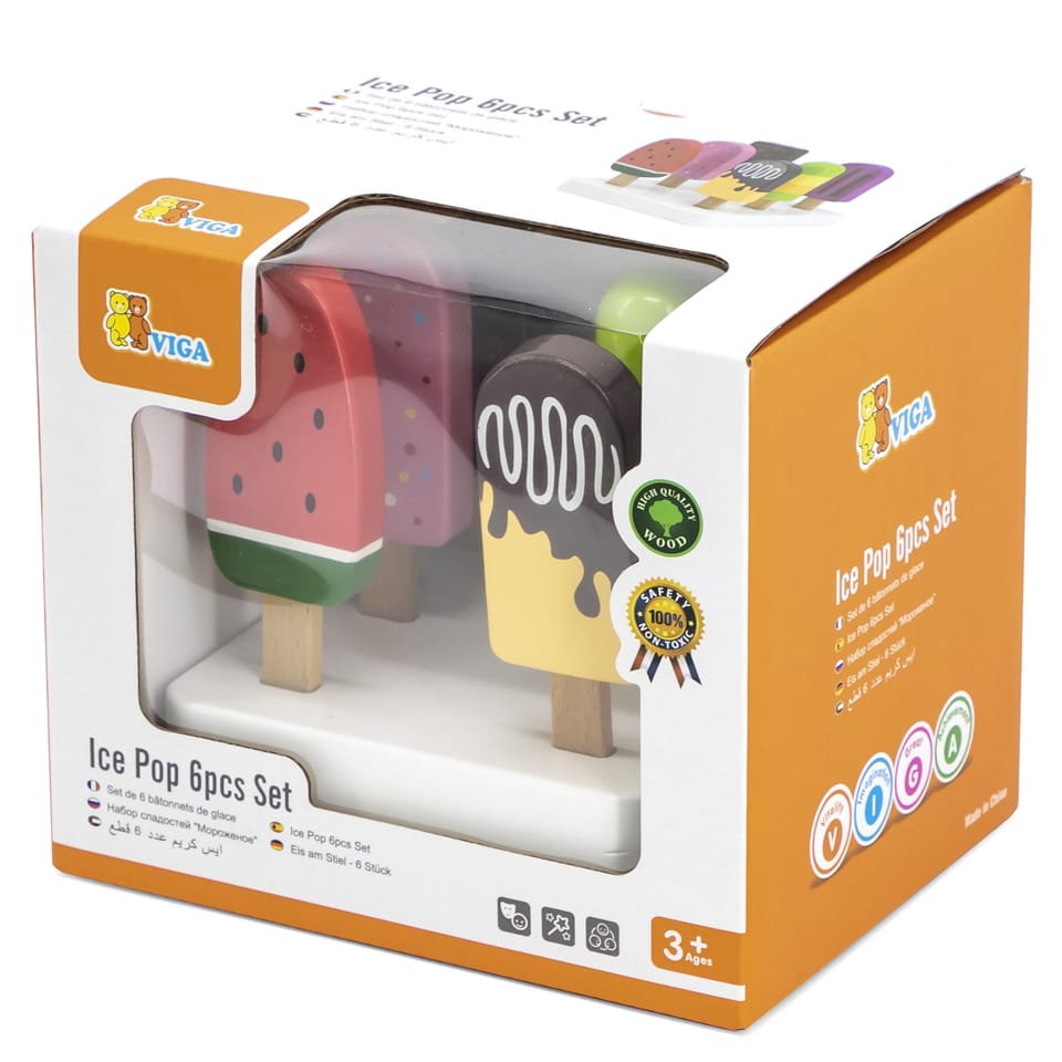 Lodowy zestaw od firmy Viga to idealny prezent, który ucieszy każde dziecko. Przyda się do odgrywania scenek z lodziarni, kawiarni czy sklepu jak również jako uzupełnienie dziecięcej kuchni.Każdy z lodów jest inny. W zestawie znajdują się takie lody jak: śmietankowy w czekoladzie i orzechami, arbuzowy, czekoladowy z mango, owocowy, jagodowy oraz truskawkowy z posypką.Wszystkie lody można ustawić na podstawce z 6 otworami.Zabawka pomoże rozwinąć u dziecka logiczne myślenie, dopasowywanie kolorów do smaków oraz zdolności manualne. Całość wykonana została z drewna bukowego i pomalowana nietoksycznymi farbami w barwy, które zadowolą każdego użytkownika i dadzą mnóstwo radości z zabawy.Dzięki estetycznemu opakowaniu zabawka jest idealna na prezent!Naszym priorytetem jest bezpieczeństwo dzieci oraz najwyższa jakość zabawek, dbamy zatem o to, aby farby którymi malujemy nasze zabawki nie były toksyczne i spełniały normy bezpieczeństwa (EN71 i ASTM).Zabawka przeznaczona dla dzieci powyżej 3 roku życia.Wymiar produktu:Wysokość loda: 110 mmWymiary podstawy: 115 x 115 x 20 mmWaga netto: 0,4 kgWymiary opakowania:Dł. 160 mm x wys. 123 mm x szer. 140 mmWaga brutto: 0,50 kgOpisy