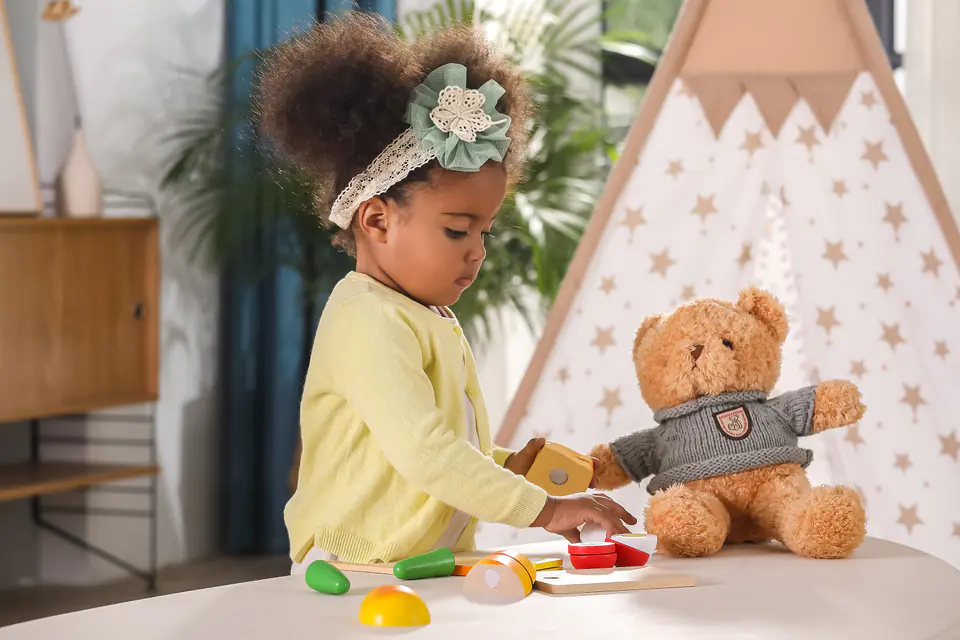 Dzieci stają się bardziej towarzyskie, kreatywne, pewne siebie. Zestaw ten kształtuje umiejętności społeczne, ćwiczy motorykę rąk, rozwija myślenie i wyobraźnię dzieci. Polecany do przedszkoli i ośrodków rozwoju. Zestaw zawiera drewniane owoce oraz akcesoria: - deska do krojenia- nożyk- chlebek tostowy- bułka długa- pomidorek- ser- jajko-ogórek
