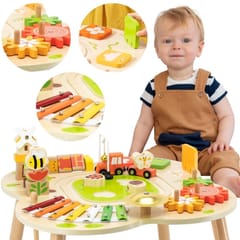 Ten drewniany stół rozwojowy od farmy Viga Toys ma jasne kolory i zaokrąglone kształty, zachęcając dzieci do używania wyobraźni i tworzenia fantastycznych historii. Jest wystarczająco duży, aby kilkoro dzieci mogło bawić się jednocześnie. Ten stolik edukacyjny jest niezwykle bogato wyposażony w wiele gier. Stół zawiera: tor kolejowy z lokomotywą i wagonikiem, sorter, talerz, obracające się koła zębate, piramidkę, ksylofon do wybijania dźwięków i wiele więcej atrakcji.