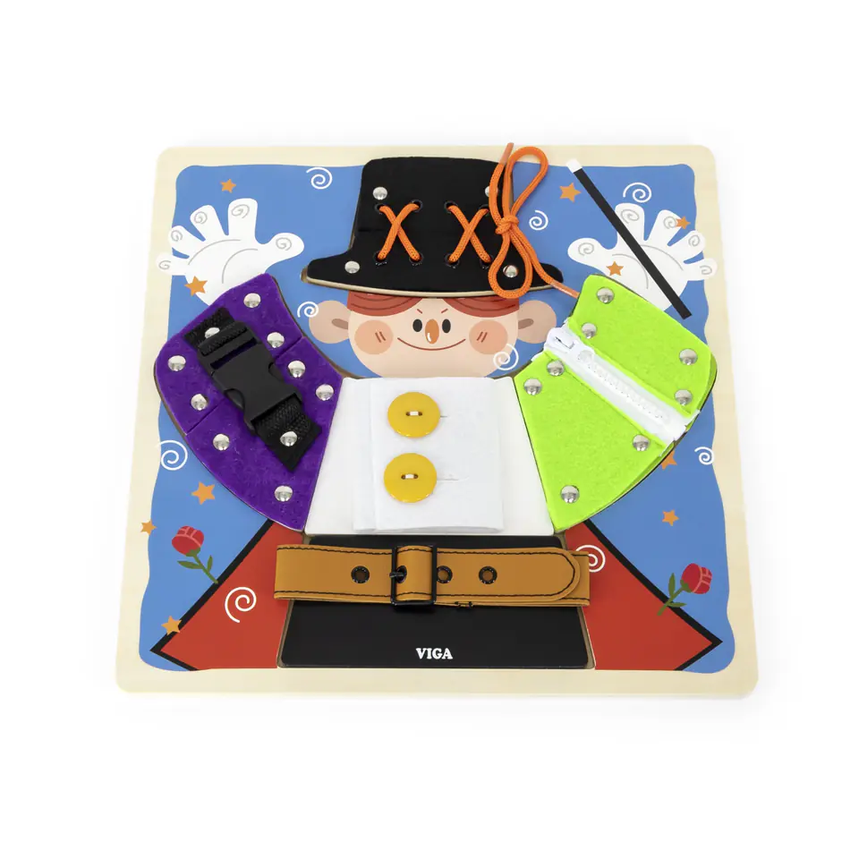 Przedstawiamy drewnianą zabawkę marki VIGA – magiczne przebieranki.To fascynująca zabawka, która zapewnia dzieciom wiele godzin kreatywnej zabawy i rozwoju. Pomaga w ćwiczeniu umiejętności ubierania się za pomocą guzików, zamka błyskawicznego, klamry, sznurówki i paska. Każdy rodzaj zapięcia jest przymocowany do jednego drewnianego elementu, układanego na planszy z wyprofilowanymi otworami. Dzieci mogą wyjąć elementy i znaleźć grafiki ukryte pod spodem.Zabawka pomaga ćwiczyć zdolności motoryczne i uczy podstawowych czynności związanych z ubieraniem się. Stymuluje rozwój wyobraźni i pomaga rozwijać umiejętność łączenia elementów w spójną całość.Całość wykonana została z drewna bukowego i pomalowana nietoksycznymi farbami, które przyciągną wzrok oraz zachęcą do zabawy dając jednocześnie mnóstwo radości. Farby są w 100% bezpieczne, spełniają normy bezpieczeństwa EN71 i ASTM.Puzzle zapakowane są w kolorowy karton, w sam raz na prezent.Zabawka przeznaczona dla maluchów powyżej 18. miesiąca życia. Cała seria zabawek VIGA została stworzona aby sprostać oczekiwaniom rodziców i dzieci w doskonaleniu procesu ich rozwoju poprzez zabawę.DANE TECHNICZNE: Wymiar produktu: dł: 300mm x wys: 25mm x szer: 300mm Wymiary opakowania: dł: 310mm x wys: 35mm x szer: 305mm Waga: 0,5kgOpisy