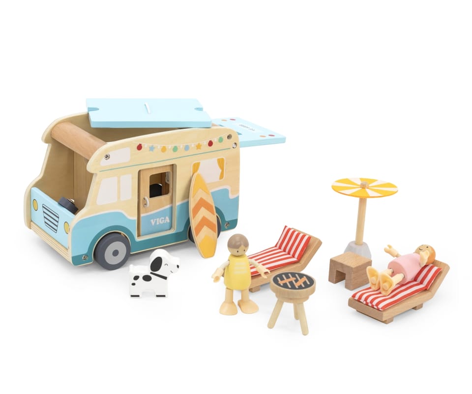Viga 44688 Drewniany Kamper to wyjątkowa zabawka, która przeniesie dzieci w świat wakacyjnych przygód i letnich podróży! Zestaw jest inspirowany beztroskimi wyjazdami nad morze, a dzięki precyzyjnym detalom i realistycznym funkcjom, jak przesuwane drzwi, podnoszony dach, czy bagażnik dachowy na deskę surfingową, zapewnia Dziecku godziny angażującej i kreatywnej zabawy. Kamper posiada bogaty zestaw akcesoriów, w tym dwie lalki, pieska, leżaki z poduszkami, parasol plażowy, grill, a nawet deskę surfingową, co pozwala na odtwarzanie różnorodnych scenariuszy zabawy. Dzieci mogą odgrywać role związane z podróżowaniem, odpoczynkiem na plaży czy organizowaniem pikniku.Solidna, drewniana konstrukcja oraz starannie dobrane w pastelowej kolorystyce, nietoksyczne farby sprawiają, że zabawka jest nie tylko estetyczna, ale także bezpieczna dla najmłodszych. Zestaw został zaprojektowany z myślą o rozwoju wyobraźni, zdolności manualnych i umiejętności społecznych dzieci, oferując jednocześnie wielogodzinną, twórczą zabawę. Idealny dla maluchów, które kochają przygody i marzą o własnym mobilnym domku na kółkach!W zestawie:- 2 drewniane figurki lalek chłopca i dziewczynki,- 2 leżaki z poduszkami,- stolik boczny,- grill,- parasol plażowy,- deska surfingowa,- toaleta,- figurka uroczego pieska,- pojazd posiada przesuwane drzwi,- podnoszony dach, - bagażnik dachowy na deskę surfingową,- łatwo otwierany bagażnik samochodowy.Zalety produktu:Wielofunkcyjność – zestaw obejmuje liczne akcesoria (lalki, leżaki, grill, parasol, piesek itp.), które zapewniają różnorodne możliwości zabawy i angażują dziecko na długie godziny.Rozwój wyobraźni – drewniany kamper i akcesoria umożliwiają Dziecku tworzenie kreatywnych scenariuszy, takich jak wakacyjne przygody, plażowe wycieczki czy grillowanie na świeżym powietrzu.Realistyczne szczegóły – kamper posiada funkcje, takie jak przesuwane drzwi, podnoszony dach, czy bagażnik na deskę surfingową, co nadaje zabawie realizmu i wzmacnia doznania z odgrywania ról.Rozwój umiejętności społecznych – Dziecko może bawić się w grupie, co sprzyja nauce dzielenia się, współpracy i komunikacji.Wspieranie zdolności manualnych – zabawa z ruchomymi elementami, takimi jak drzwi kampera czy akcesoria, rozwija precyzję ruchów dłoni i koordynację ręka-oko.Nauka przez zabawę – dziecko uczy się podstawowych pojęć związanych z podróżowaniem, planowaniem wycieczek, odpoczynkiem, a także porządkiem w otoczeniu (np. przechowywanie akcesoriów w bagażniku).Bezpieczna zabawa – zabawka wykonana jest z wysokiej jakości drewna i wykończona nietoksycznymi farbami, co zapewnia bezpieczeństwo podczas zabawy.Korzyści dla Dziecka:- Poprawa zdolności manualnych podczas układania elementów i manipulowania akcesoriami,- Rozwój wyobraźni dzięki odgrywaniu różnych scenariuszy związanych z podróżami i wakacjami,- Wspieranie interakcji społecznych, gdy dziecko bawi się wspólnie z rodzeństwem lub przyjaciółmi, rozwijając przy tym umiejętności komunikacyjne,- Nauka podstawowych pojęć związanych z podróżami, odpoczynkiem i rekreacją, w przyjazny i angażujący sposób.Jak korzystać z produktu:Dzieci mogą bawić się lalkami i pieskiem oraz akcesoriami odgrywając różne scenariusze związane z wyjazdami na wakacje. Mogą wyobrazić sobie, że jadą na plażę, biwakują na świeżym powietrzu lub surfują na falach, używając do tego dołączonej deski surfingowej. Tworzenie kempingowej atmosfery. Kamper ma otwierane drzwi, podnoszony dach i bagażnik, co pozwala Dzieciom z łatwością otwierać pojazd i zorganizować kemping. Mogą rozłożyć leżaki, ustawić parasol plażowy, a następnie przygotować wyimaginowany posiłek na grillu. Zestaw świetnie nadaje się do zabawy w grupie – dzieci mogą dzielić się rolami, np. jeden maluch kieruje kamperem, drugi przygotowuje grill, a trzeci pilnuje pieska. To doskonała okazja do rozwijania umiejętności współpracy i komunikacji. Maluchy mogą przesuwać drzwi, podnosić dach i otwierać bagażnik, by ustawić wszystkie akcesoria wewnątrz kampera. To uczy dzieci porządku i organizacji, rozwijając przy tym motorykę małą.Elementy zabawki zostały zapakowane w estetyczny, kolorowe pudełko, dzięki temu estetycznemu opakowaniu zabawka jest idealna na prezent! Całość wykonana została z drewna bukowego i pomalowana farbami, które zadowolą każdego użytkownika i dadzą mnóstwo radości z zabawy.Naszym priorytetem jest bezpieczeństwo i jakość oferowanych produktów, dlatego dbamy o to aby farby, którymi malujemy nasze zabawki spełniały normy bezpieczeństwa (EN71 i ASTM). Zabawka przeznaczona dla dzieci powyżej 3 roku życia.Wymiary produktu:Dł.190 mm x wys. 150 mm x szer. 118 mmWymiary opakowania:Dł.235 mm x wys. 150 mm x szer. 150 mmWaga netto: 0,6 kgWaga brutto: 0,7 kgIlość kartonowa: 8 szt.Opisy