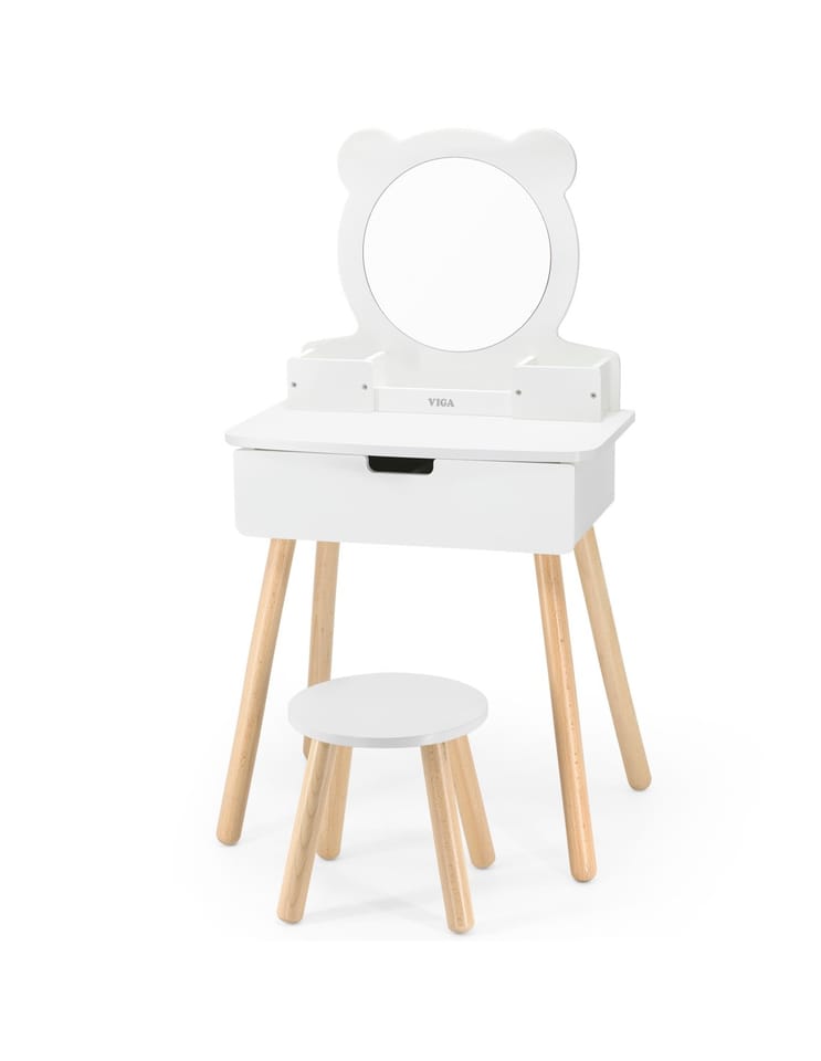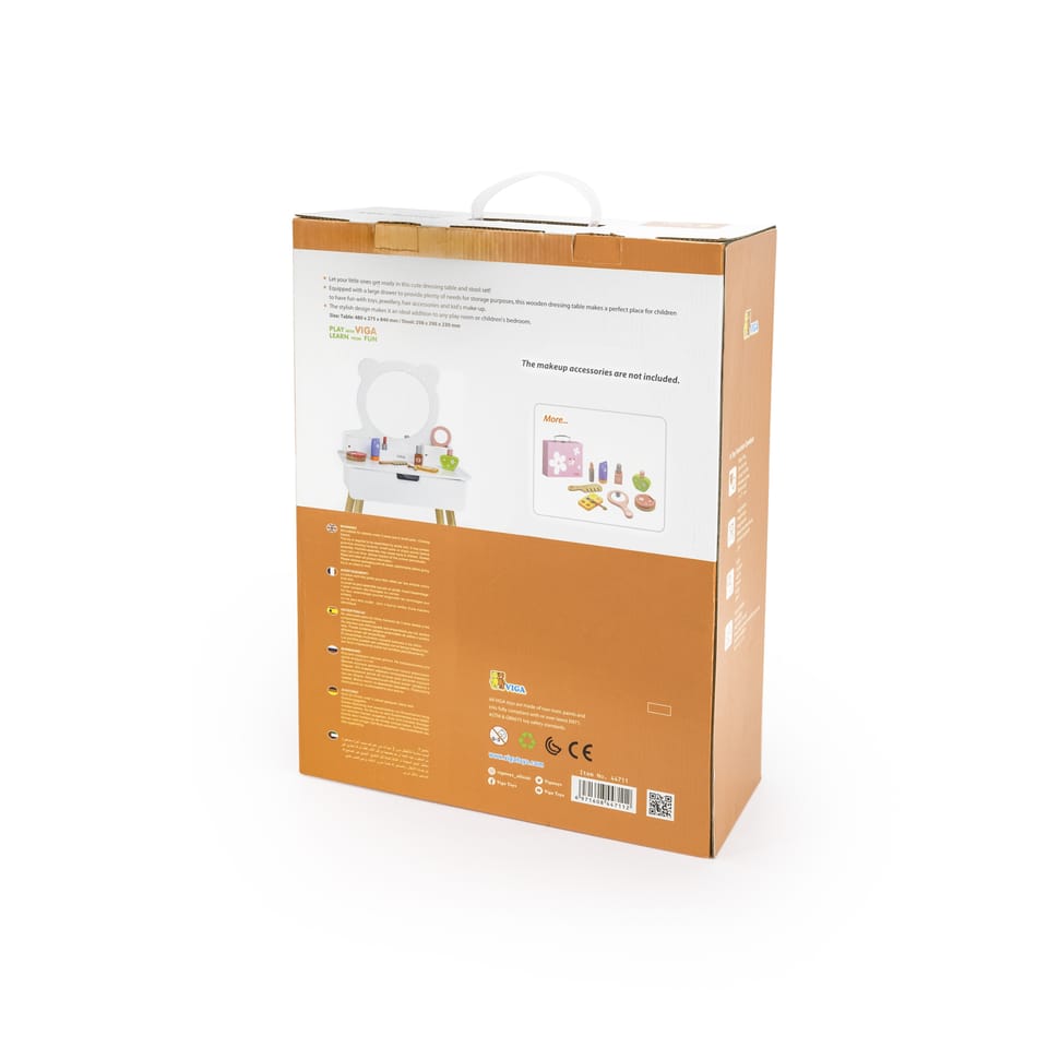 Coś nowego dla małych księżniczek przygotowała marka VIGA - Drewniana toaletka z lustrem i siedziskiem.Każda mała dziewczynka naśladuje swoja mamę i chętnie będzie korzystać z tej uroczej drewnianej toaletki z lustrem i stołeczkiem miejsce do pielęgnacji oraz wykonania makijażu. Ta toaletka to wszystko czego potrzebuje w domowym salonie nasza miała wizażystka, a wysuwana szuflada pomieści wszystkie niezbędne akcesoria, biżuterię lub inne skarby. Spraw dziecku wspaniały prezent, który zabierze go w podróż do krainy wyobraźni. Niech stworzy swój własny gabinet kosmetyczny, gdzie ulubiona lalka potrzebują pielęgnacji, czy nowego makijażu. Biała toaletka to zestaw z lustrem i stołeczkiem, posiada wysuwaną szufladę umieszczona pod blatem z przegródkami, a na blacie pod lustrem umieszczone są 3 małe schowki- niezbędniki do segregacji przyborów do pielęgnacji Małej księżniczki. Elegancki zestaw pasuje do każdej sypialni, będzie ulubionym miejscem zabaw. Doskonała i wprost wymarzona toaletka do zabawy w domu w pielęgnację urodową dla małych dziewczynek. Mała dama korzystając z toaletki może tworzyć niesamowite fryzury, makijaże, czy przebieranki. Dziecko podczas zabawy rozwinie swoją estetykę. Drewniana toaletka z lustrem jest to świetna zabawka dla dzieci, które uwielbiają kreatywne odgrywanie ról używając wyobraźni. Mamo dołącz do zabawy i pokaż Twojemu dziecku jak ważne jest, aby być zadbanym i pięknie wyglądać w codziennym życiu.Dziecko naśladując dorosłych rozwija swoje zdolności motoryczne oraz wzmacnia rozwój umiejętności społecznych w tym swobodnej konwersacji, czy wiedzę o pielęgnacji urody. Zabawka od marki VIGA zachęca dziecko do pomysłowej zabawy i rozwija umiejętności społeczne.Zestaw zawiera:- Biała drewniana toaletka z lustrem,- Biały stołeczek,- Wysuwana szuflada pod blatem.Zabawka została zapakowana w kolorowy karton. Dzięki temu estetycznemu opakowaniu zabawka jest idealna na prezent!Całość wykonana została z drewna bukowego i pomalowana nietoksycznymi farbami o pastelowych barwach, które zadowolą każdego użytkownika i dadzą mnóstwo radości z zabawy.Zabawka przeznaczona jest dla dzieci od 36 miesiąca życia.Z tej tematyki proponujemy: - Viga 59694 Szkatułka z biżuterią