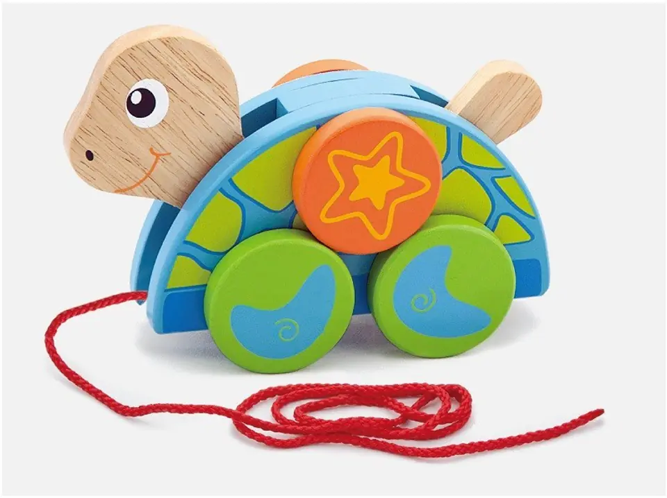 A cute turtle on a string from Viga will work as a help for children who are starting to take their first steps. Vivid colors and colorful elements will be an additional attraction and encouragement to improve walking skills. A small turtle is hooked on a red string. When a child pulls the string, head and tail of a pet, they will begin to move in a funny way.