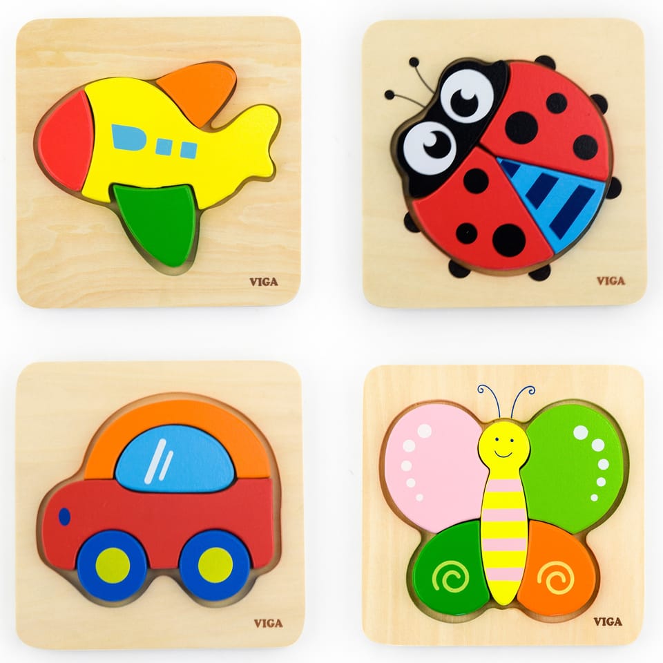 The whole collection of the first puzzles for the youngest children from VIGA. Colorful and very simple Baby Puzzle from Vig. Includes three to five elements to be laid on a wooden stand. When the child correctly adjusts the shapes, a puzzle with a new friend will be created. The picture is in vivid colors that will attract the attention of the bow.