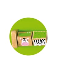 Puzzle – logical blocks with animals, a child turning the blocks appropriately can arrange four animals: crocodile, zebra, elephant and tiger.
