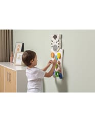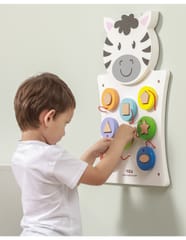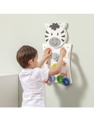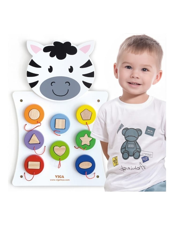 The panel to hang on the wall, depicts a cheerful zebra, which has various shapes on its tummy.
