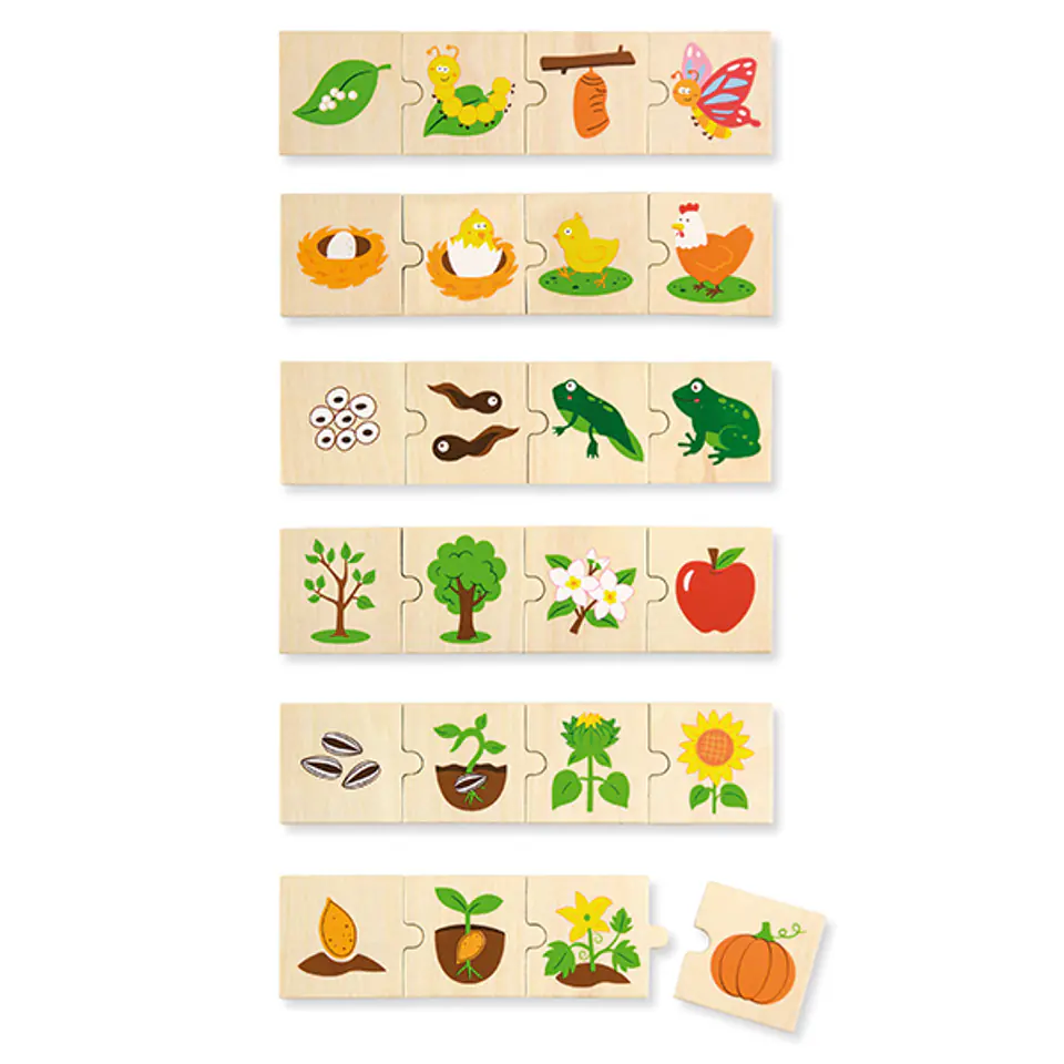 The set includes 24 wooden elements on which there are colorful pictures depicting the stages of development of animals and plants. Puzzles are compatible – they can be freely combined.