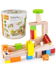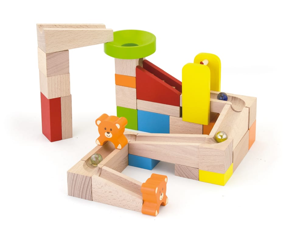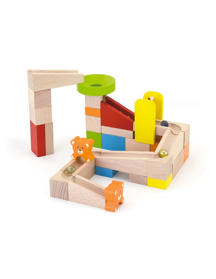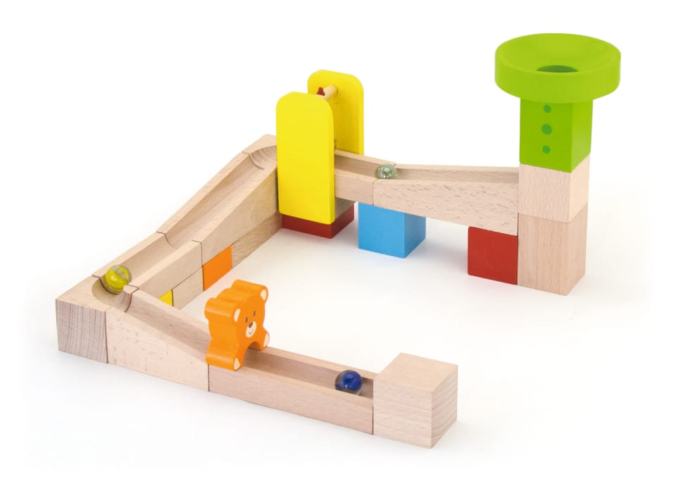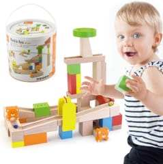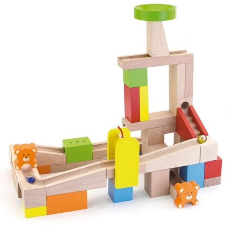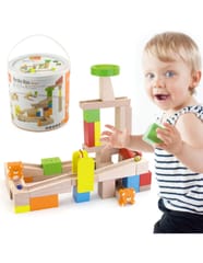 The Kulodrom building, consisting of high-quality wooden, natural blocks, offers our small architects many opportunities for creative and revealing and imaginative fun. The set includes 10 cards showing combinations of kulodrome settings, with different levels of difficulty. Try to build the track shown on the card or create your own fantastic construction from 49 elements! The set includes steps and teddy bears for an additional attraction for your child. The whole is packed in a convenient bucket with a handle, facilitating safe storage of parts and carrying the toy.