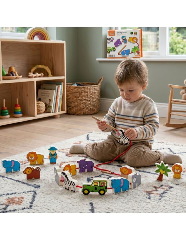 The ability to support the development of motor skills and motor coordination in children in the form of play. One way is to thread the blocks. The threading kit includes wooden figures that have drawings on both sides. Also in the complete set there is a string with a rod made of wood. The child will be able to thread the figurines in any order, which contributes to the development of logical thinking, motor skills and coordination. As a result, the child will receive an interesting and garland of multi-colored figurines, which will be an excellent toy for the child.