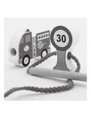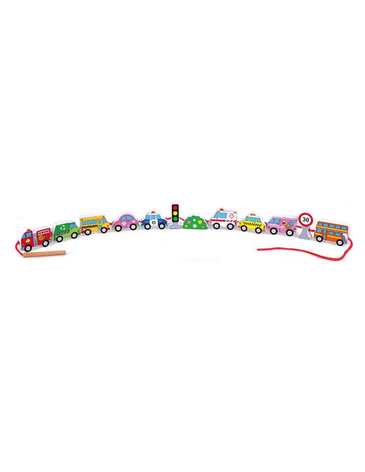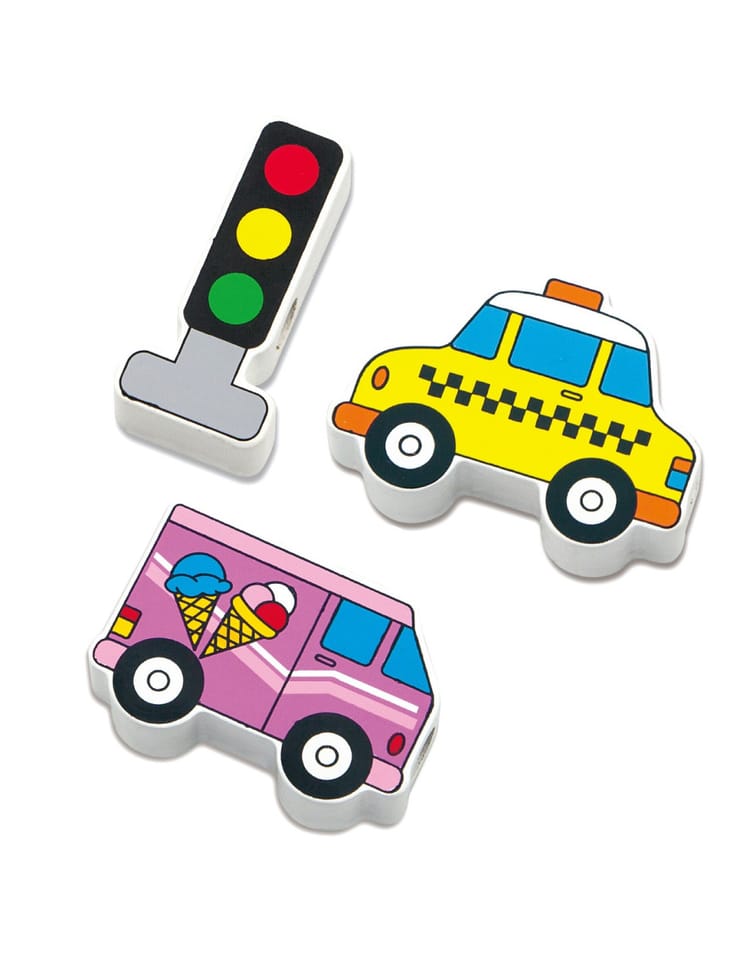 The 12 elements include: fire truck, garbage truck, school bus, pink hunchback, police car, ambulance, taxi, ice cream car, and a double-decker bus, additionally a speed limit sign, traffic light, and a flowery bush. In addition, a string with a peg for threading.
