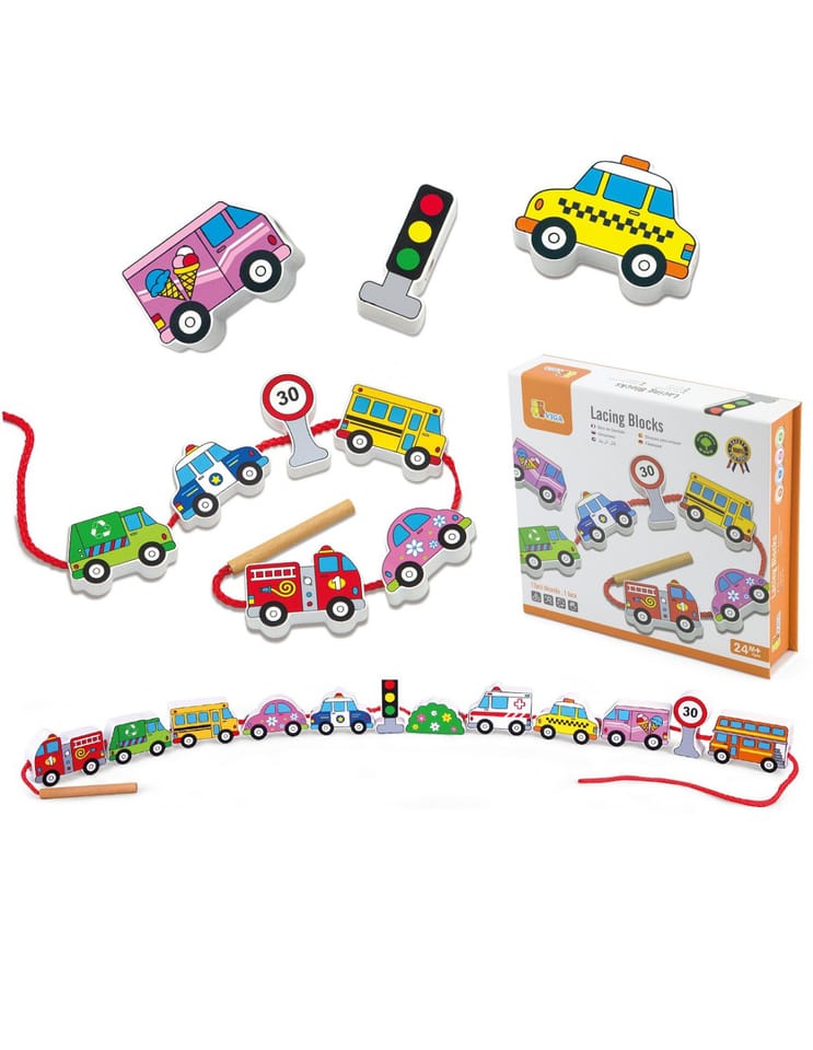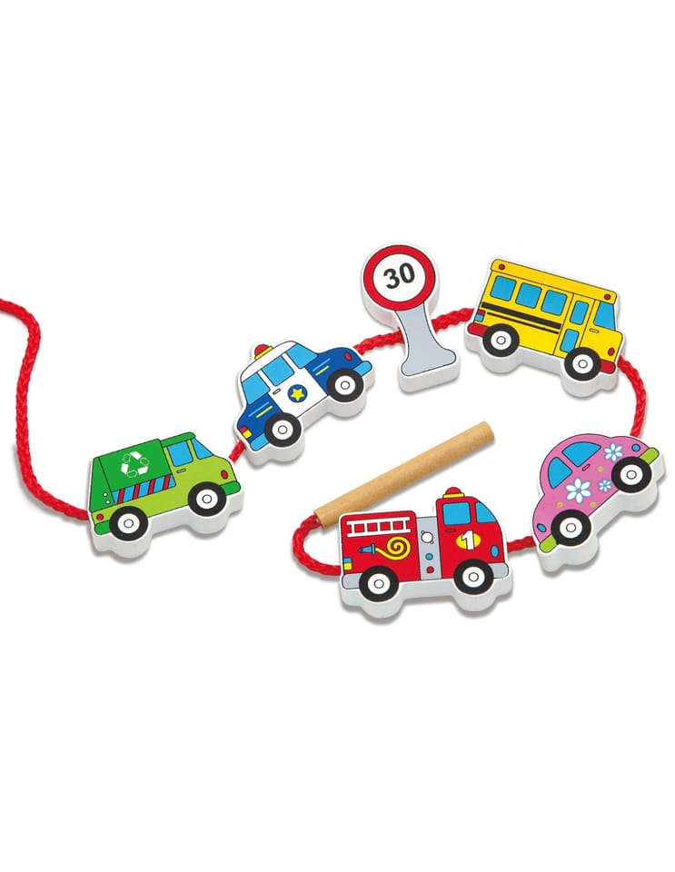New from Vig – the threaded "Vehicles on the road". The toy is made with care - each of the 12 elements has been hand-painted on both sides. Beautiful and colorful blocks will encourage you to play. In the set with the blocks there is a string with a wooden pin - which will be used to thread the blocks in any order. A toy perfect for small hands, blocks will familiarize your little one with vehicles on the road. It will stimulate his curiosity and also provide many hours of fun – blocks can be arranged in any way, as well as create your own stories related to car travel.