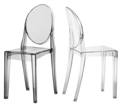 Made from a single piece of polycarbonate, the chair combines clean design and strong structure with a lightness of appearance. The rounded upper part of the backrest contrasts with the square seat creating an unexpectedly elegant whole. Despite the delicacy of the form, the chair is stable and solid, and additionally resistant to the weather.,The presented product is inspired by the Victoria design.The maximum load is 120kg