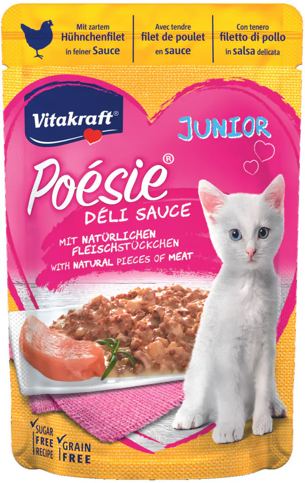 Complete wet food for cats in a delicious delicate sauce. With high-quality natural pieces of meat or fish - visible high quality. It does not contain sugar or cereals, as well as artificial preservatives, dyes and flavors. A wide range of flavors: 6 variants for adult cats and 2 special ones in the JUNIOR version.