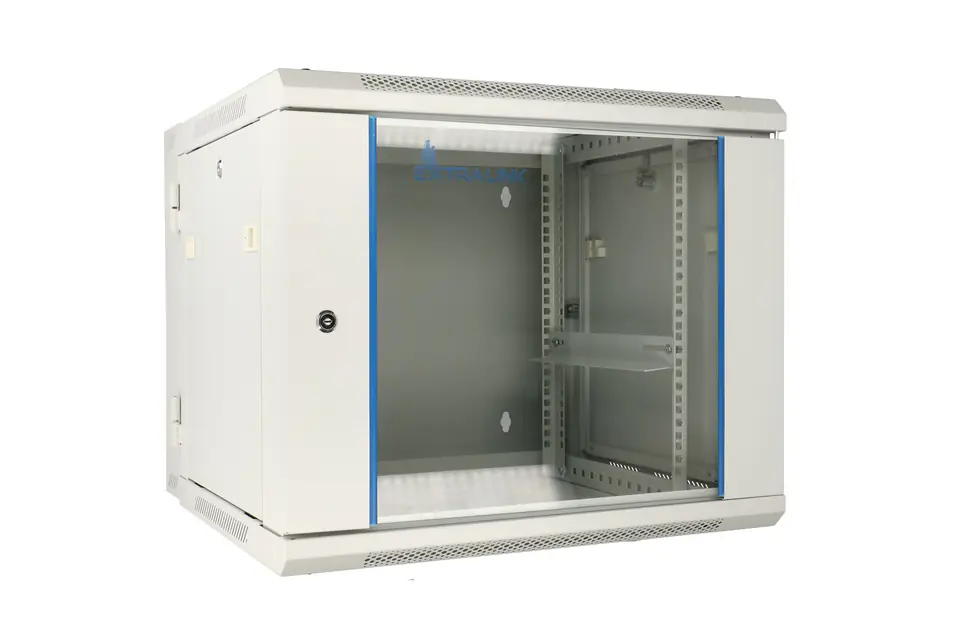 The Extralink cabinet is designed for wall mounting in offices, network server rooms and control rooms for CCTV installations. The external walls were made of cold-rolled steel sheet, while the front door has a tempered glass window with the possibility of opening to the left or right side. The set includes a set of keys, M6 square nuts for the rack rail, a set for twisting the cabinet and a full set of screws. Two-section construction facilitates access from the rear to installed components.