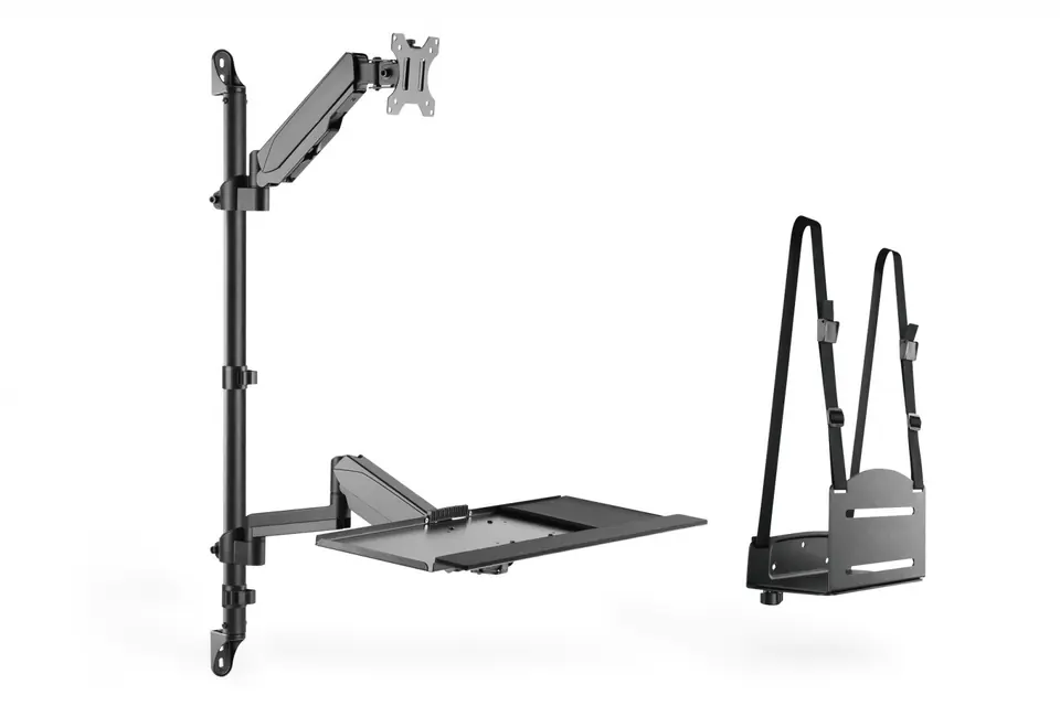 Universal wall mount for mounting a monitor, keyboard / mouse and PC with flexible working height adjustment. Prepare a workplace that can accommodate multiple people's working height despite the difference in height thanks to the three quick steps. Two integrated gas springs make adjusting the height of the monitor and keyboard shelf child's play. The set includes a PC holder for wall mounting.