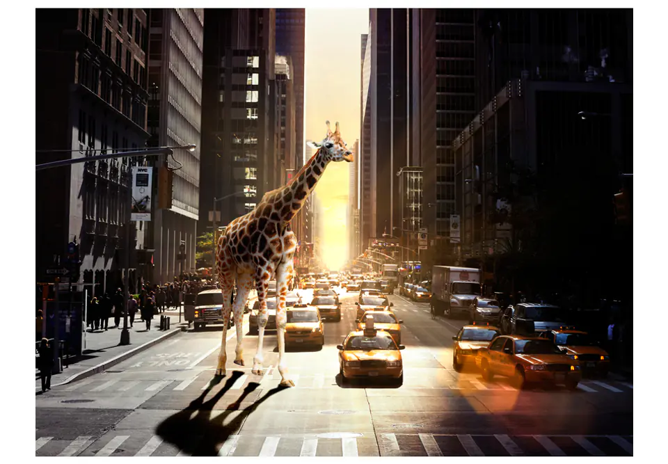 Durable, water and scratch-resistant fleece wall mural "Wall mural - Giraffe in the big city" to stick to the wall. Wall mural "Wall mural - Giraffe in the big city" with an inspiring motif will be an effective decoration of any room. Fleece wallpapers are mounted on glue. They can be installed in any room, even a bathroom or kitchen. Fleece wallpaper, semi-matte coating. Fleece hides minor imperfections of the wall. It creates a warming insulating layer and allows the walls to breathe. Waterproof printing is very durable.