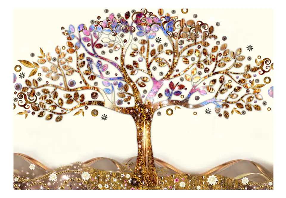 Durable, water and scratch-resistant fleece wall mural "Wall mural - Golden tree" to stick to the wall. Wall mural "Wall mural - Golden tree" with an inspiring motif will be an effective decoration of any room. Fleece wallpapers are mounted on glue. They can be installed in any room, even a bathroom or kitchen. Fleece wallpaper, semi-matte coating. Fleece hides minor imperfections of the wall. It creates a warming insulating layer and allows the walls to breathe. Waterproof printing is very durable.