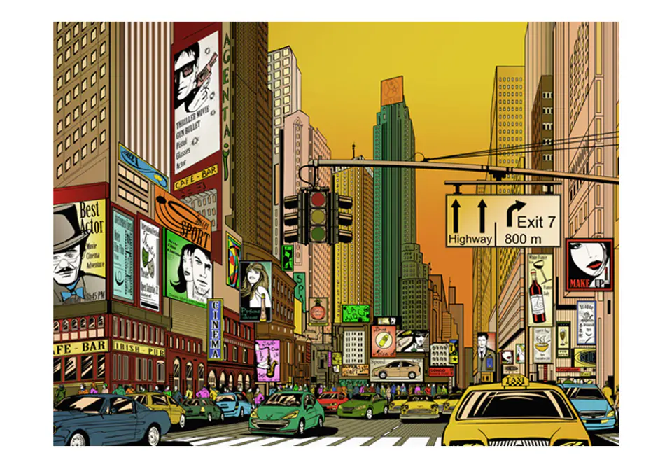 Durable, water and scratch-resistant fleece wall mural "Wall mural - New York - a bustling city" to stick to the wall. Wall mural "Wall mural - New York - a bustling city" with an inspiring motif will be an effective decoration of any room. Fleece wallpapers are mounted on glue. They can be installed in any room, even a bathroom or kitchen. Fleece wallpaper, semi-matte coating. Fleece hides minor imperfections of the wall. It creates a warming insulating layer and allows the walls to breathe. Waterproof printing is very durable.