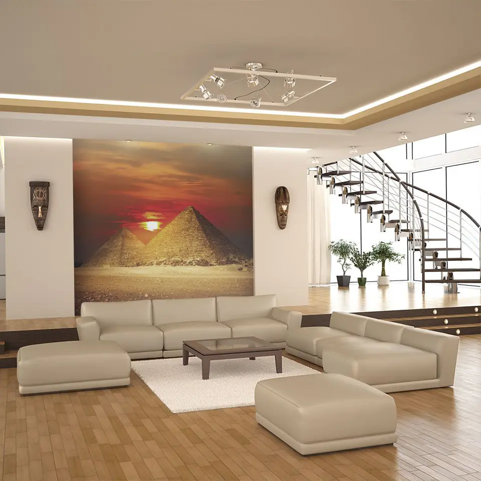 Durable, water and scratch-resistant fleece wall mural "Wall mural - Pyramids of Giza - sunset" to stick to the wall. Wall mural "Wall mural - Pyramids of Giza - sunset" with an inspiring motif will be an effective decoration of any room. Fleece wallpapers are mounted on glue. They can be installed in any room, even a bathroom or kitchen. Fleece wallpaper, semi-matte coating. Fleece hides minor imperfections of the wall. It creates a warming insulating layer and allows the walls to breathe. Waterproof printing is very durable.