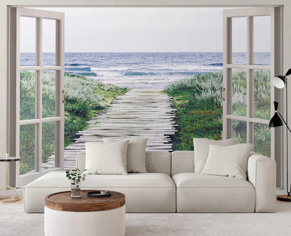 Wall mural, Window - footbridge to the beach Size 280x200