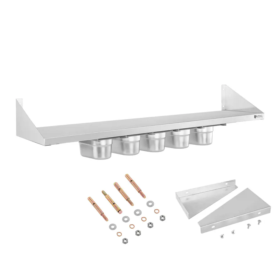 Hanging stainless steel shelf RCWR-5 GN1/9 Royal Catering will work in catering kitchens, laboratories, workshops, warehouses, workshops, etc. However, the five GN 1/9 containers that are available in the set are suitable for storing spices, dried fruits, dried fruits, as well as small accessories.