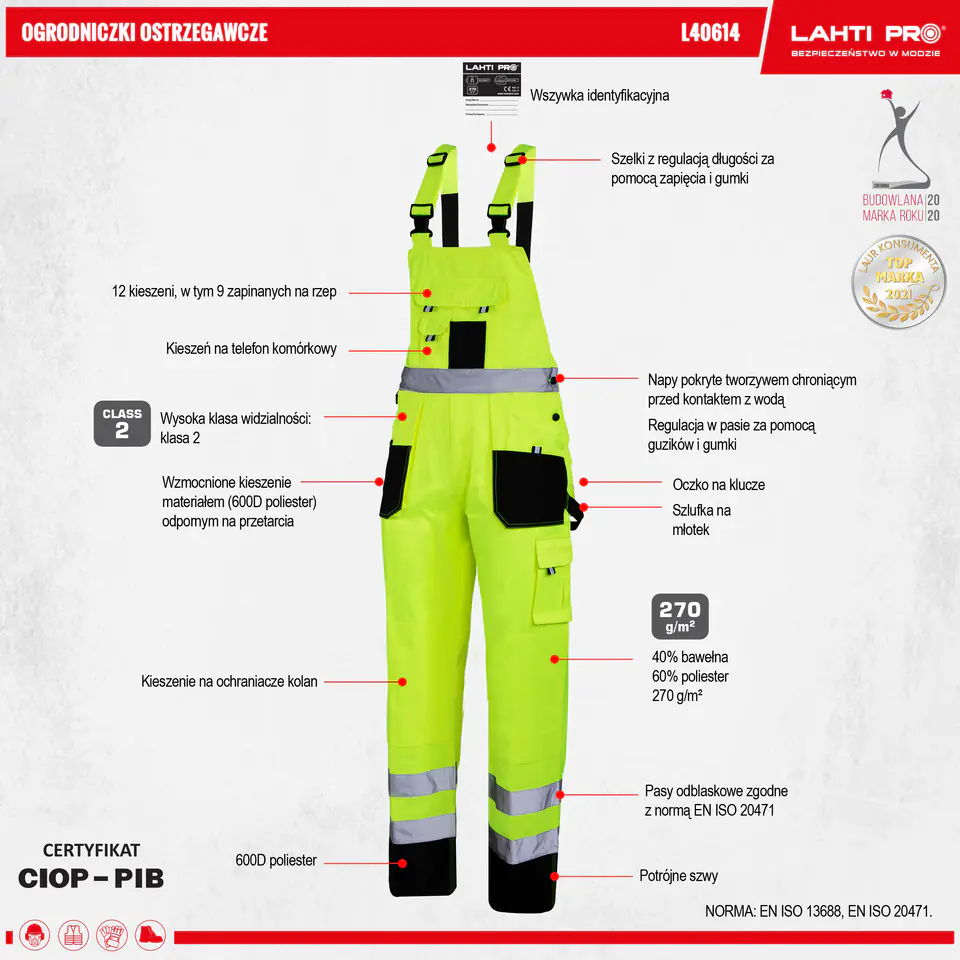 Reflective work pants of the Lahti Pro L40614 dungaree are characterized by a modern, comfortable cut. The dungarees are made of a material with a weight of 270g / m2, which consists of 40% cotton and 60% polyester. Twelve comfortable and functional pockets including nine velcro fastened. Lahti Pro L40614 dungarees are sewn with double seams. Shoulder straps with adjustable length by means of a clasp and an elastic band. Press studs covered with plastic protecting against contact with water. Pockets for knee pads - Lahti Pro model LPN001 . Lahti Pro dungaree pants are equipped with an identification tab, a pocket for a mobile phone. Additional reinforcement of the pocket with 600D POLYESTER material resistant to abrasion and tearing. Lahti Pro L40614 dungaree protective pants are in the second category of personal protective equipment. Reflective stripes of the vest comply with the EN ISO 20471 standard issued by the Central Institute for Labor Protection (CIOP) CE declaration and meet the provisions of the EN ISO 13688 standard.
