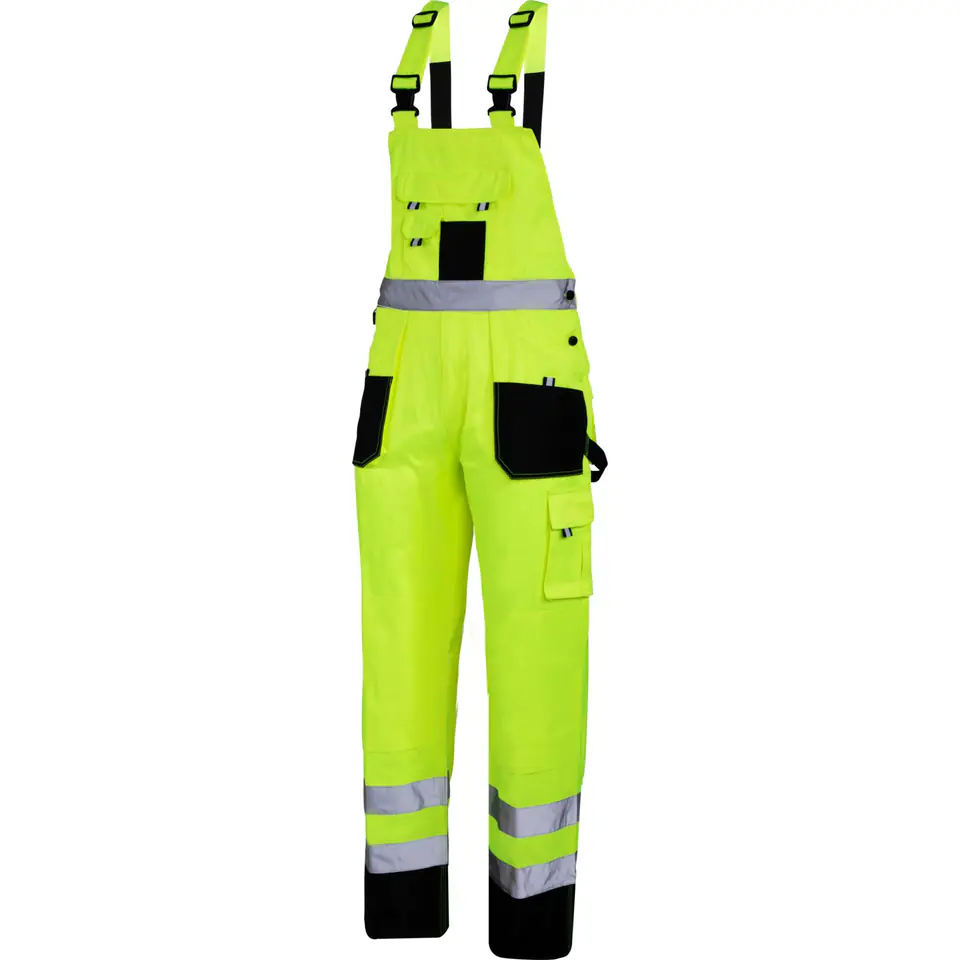 Reflective work pants of the Lahti Pro L40614 dungaree are characterized by a modern, comfortable cut. The dungarees are made of a material with a weight of 270g / m2, which consists of 40% cotton and 60% polyester. Twelve comfortable and functional pockets including nine velcro fastened. Lahti Pro L40614 dungarees are sewn with double seams. Shoulder straps with adjustable length by means of a clasp and an elastic band. Press studs covered with plastic protecting against contact with water. Pockets for knee pads - Lahti Pro model LPN001 . Lahti Pro dungaree pants are equipped with an identification tab, a pocket for a mobile phone. Additional reinforcement of the pocket with 600D POLYESTER material resistant to abrasion and tearing. Lahti Pro L40614 dungaree protective pants are in the second category of personal protective equipment. Reflective stripes of the vest comply with the EN ISO 20471 standard issued by the Central Institute for Labor Protection (CIOP) CE declaration and meet the provisions of the EN ISO 13688 standard.