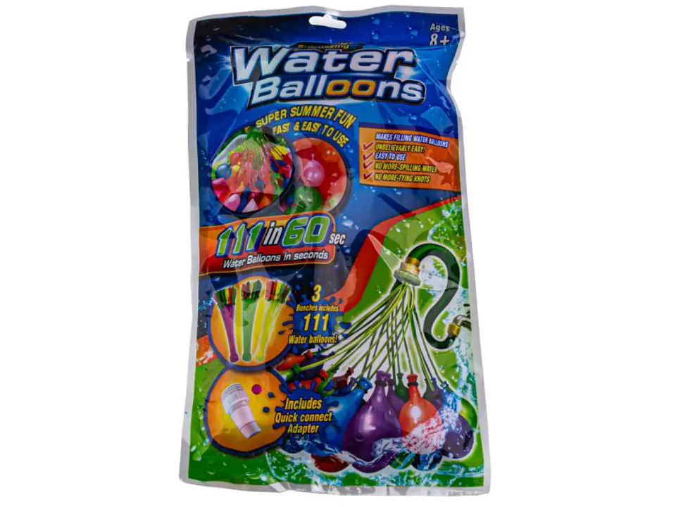 The set includes 111 self-closing balloons and a tap cap, so that filling the balloons will only take a moment. It is enough to fill the balloons with water, and the rubber band on the balloon will tighten itself, closing the balloon tightly.