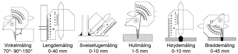 Allows you to measure the weld in the corner. Weld height for flat welds. Height/thickness of the material. Angle measurement. The distance between the sheets. Hole diameters.