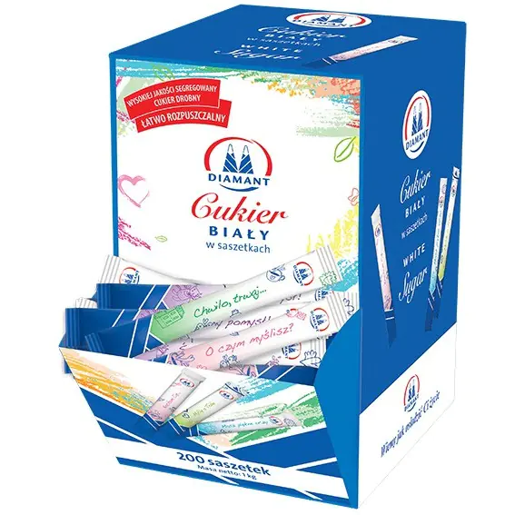 DIAMANT White sugar in sachets is a fine, easily dissolving, segregated white sugar of the first category, packed in oblong, hygienic, aesthetic sachets. It is perfect for hotels, restaurants, bars, mass caterers and hospitals. Indispensable during conferences, business or social meetings, irreplaceable on the go. There are 200 sachets in the package. The product is packed in a 1 kg cardboard box.