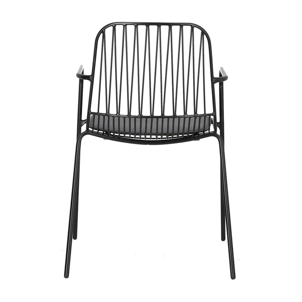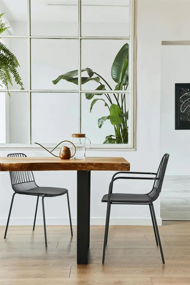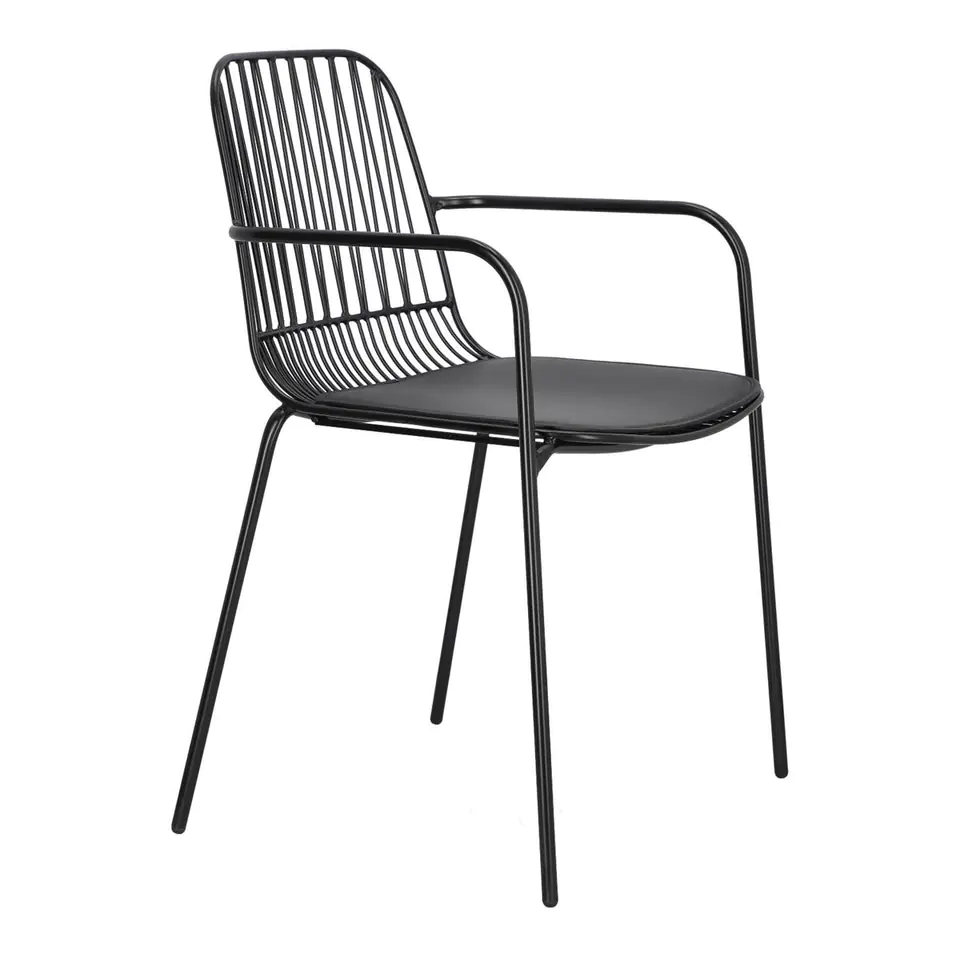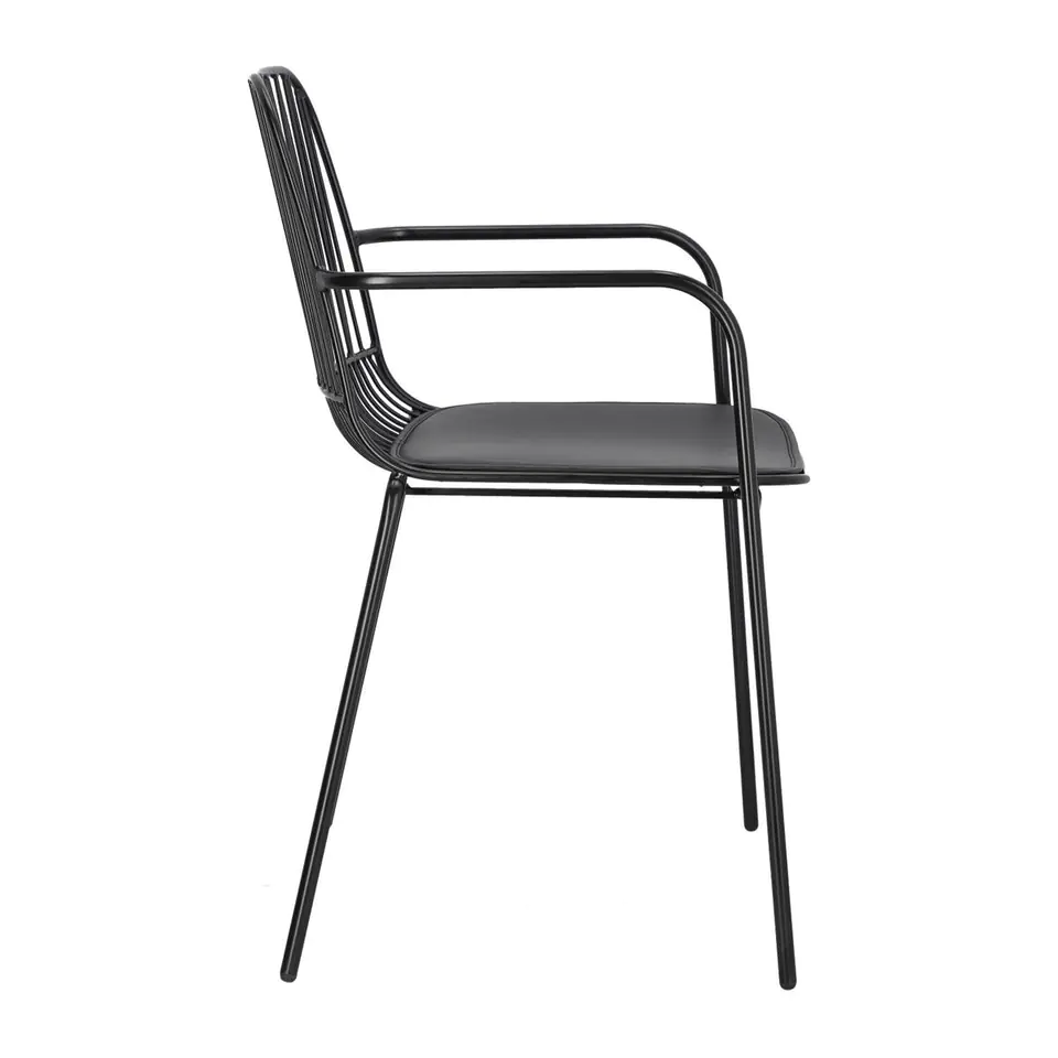 The black metal Willy chair with armrests is an industrial piece of furniture that will delight with its design. Willy's chairs were powder coated black. The semi-matt finish of the chairs gives them a classic and subdued look. The chair is made of precisely connected metal brackets. The seat of the chair is equipped with a soft cushion made of upholstery foam, which has been trimmed with eco leather. The legs of the chair have been secured with plastic feet that prevent the floor from scratching. Seat width; 44,5 cm Seat depth: 45 cm Chair weight: 6 kg Package dimensions: 67x91x58 cm Max. 4pcs. in a carton