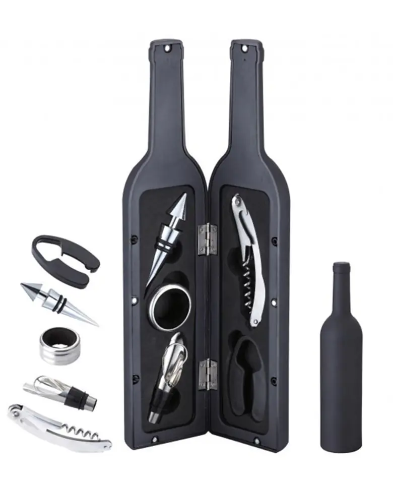 A set of wine utensils in a case in the form of a folding bottle.