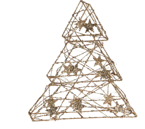 Wire Christmas decoration 29 cm gold Christmas tree A beautiful shiny Christmas tree illuminated with 14 lights in warm white will bring a pleasant mood to your surroundings. You can put it literally anywhere, because it is powered by batteries. Table, window sill, chest of drawers, everywhere will look phenomenal. It will work great in small rooms where a traditional Christmas tree will not fit. Specification height: 29 cm, battery-powered: 2xAA (not included), light color: warm white, Christmas tree color: gold-glitter, material: metal, timer 6/18 h.