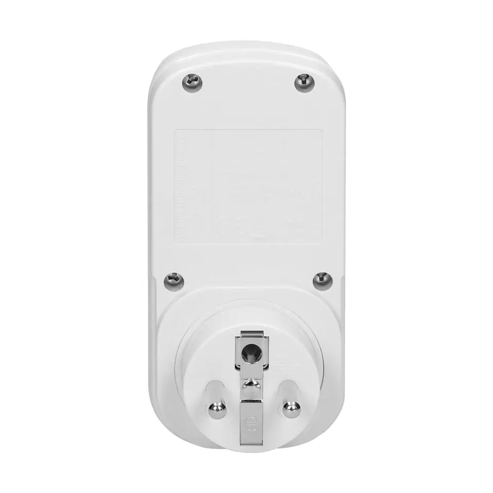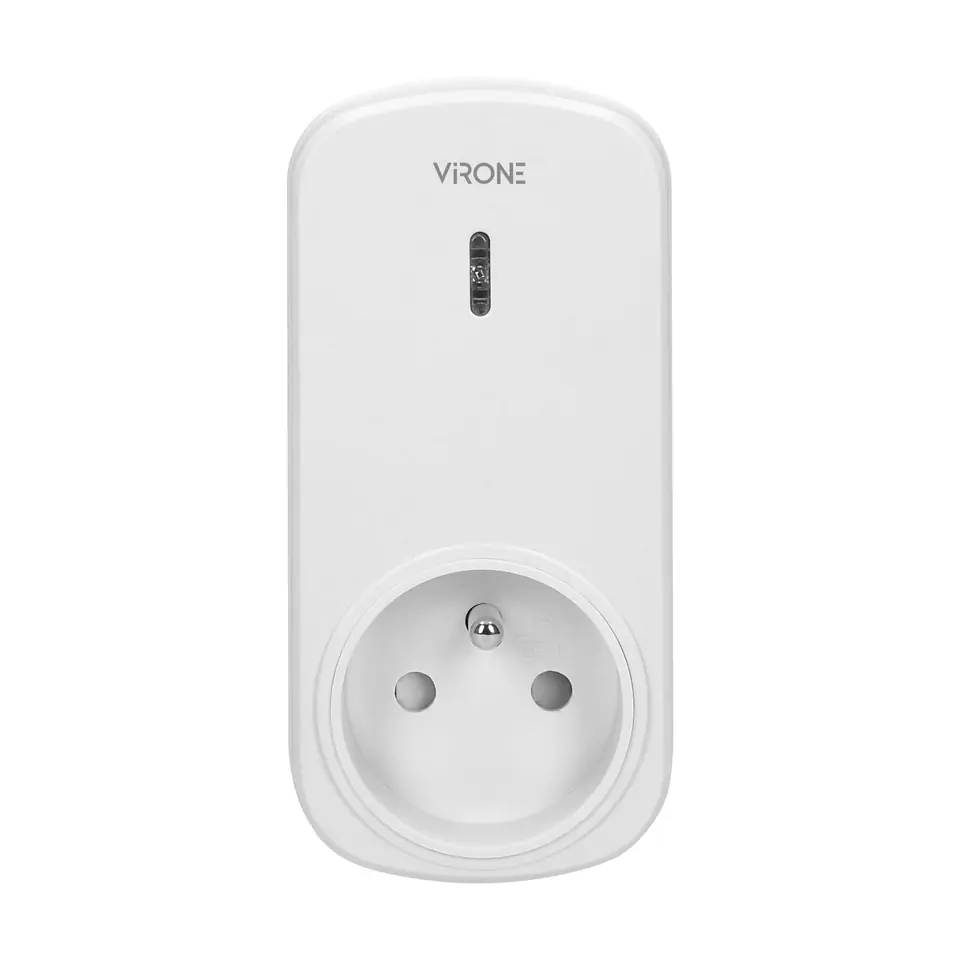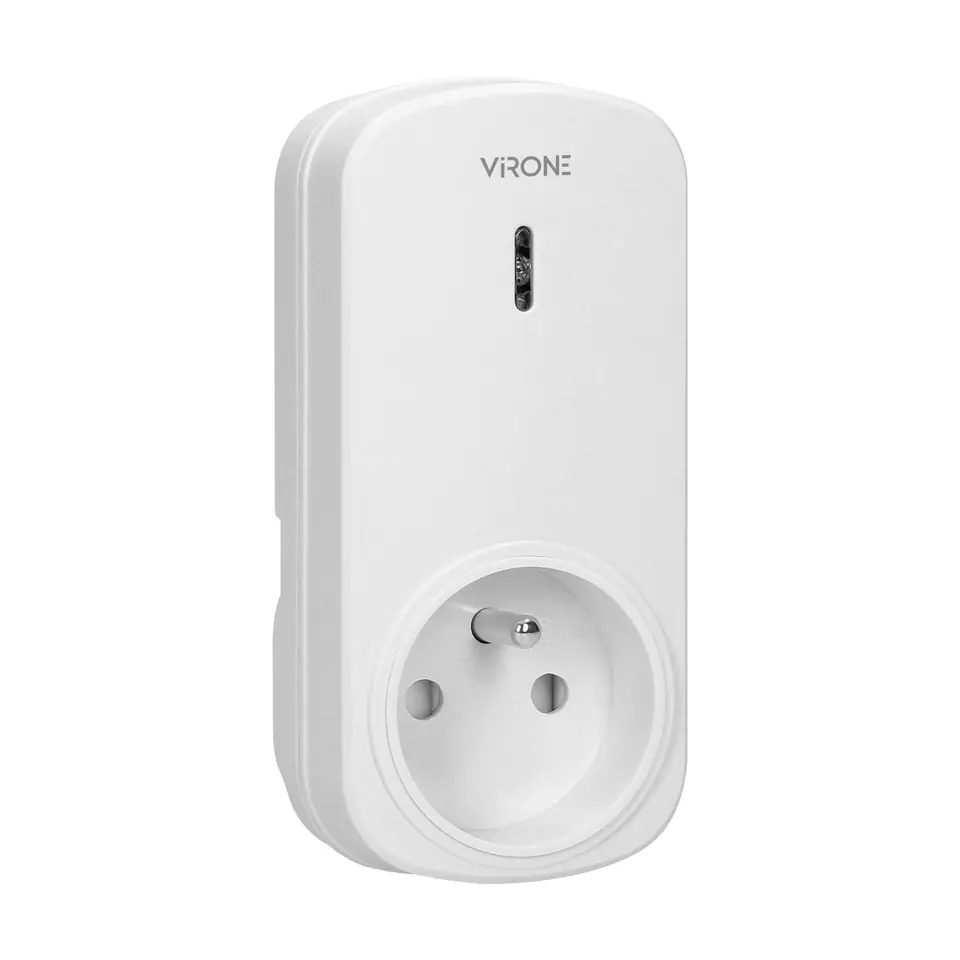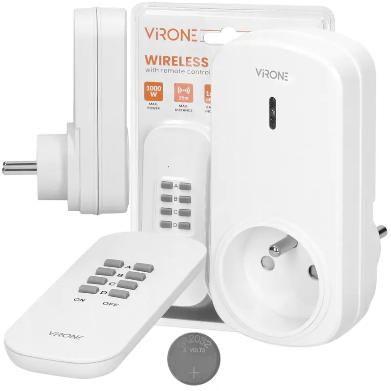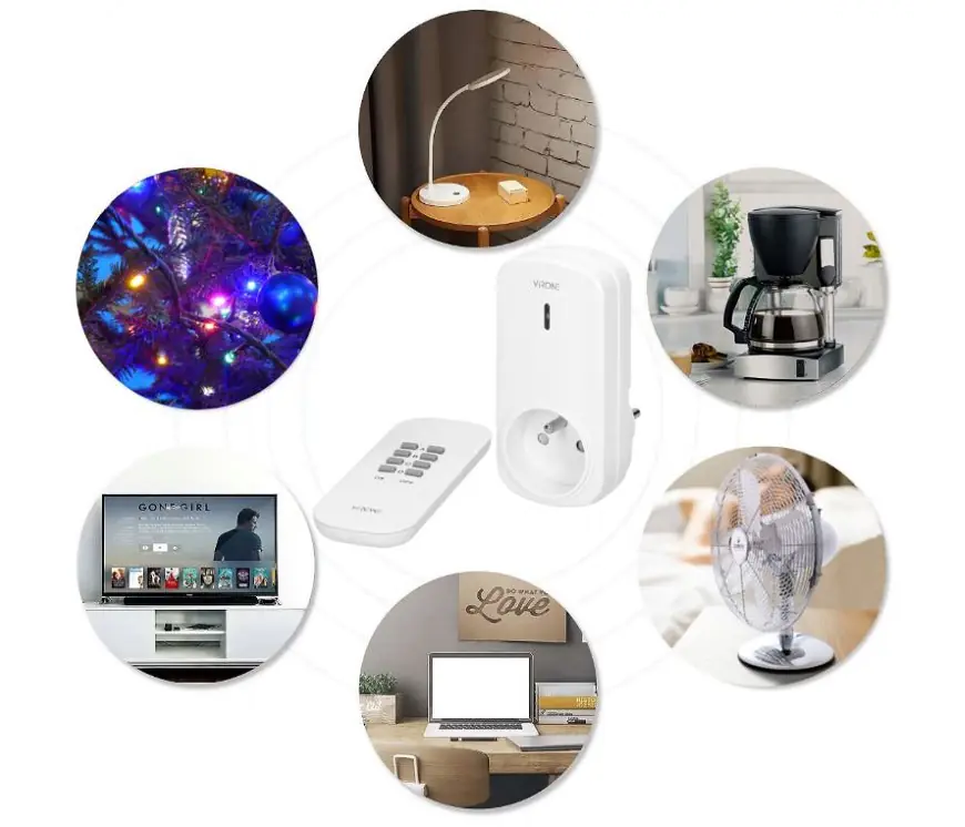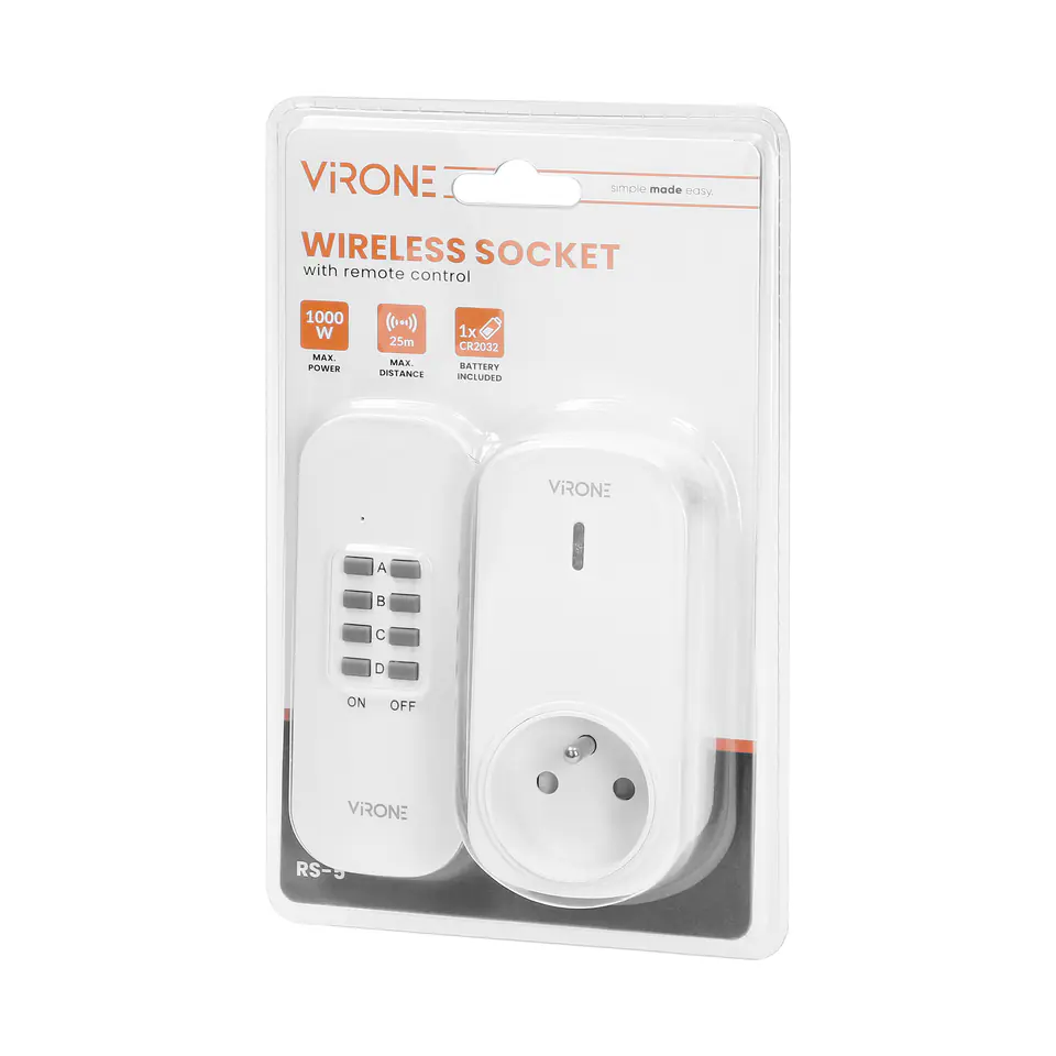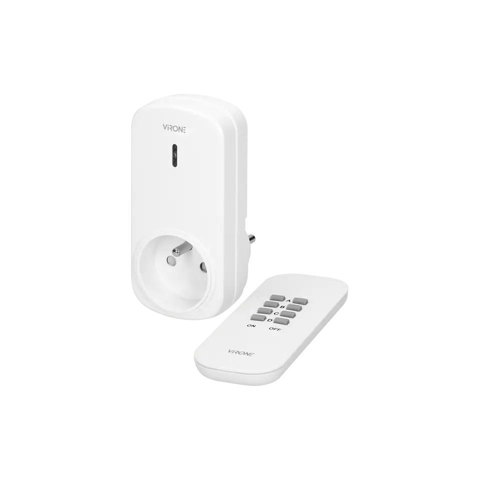 A socket for wireless switching on and off of electrical devices indoors m.in lamps, TV, fans, air conditioners, etc. Switching on and off is carried out using the remote control (transmitter) or directly on the receiver. The devices have a learning system function (automatic login).