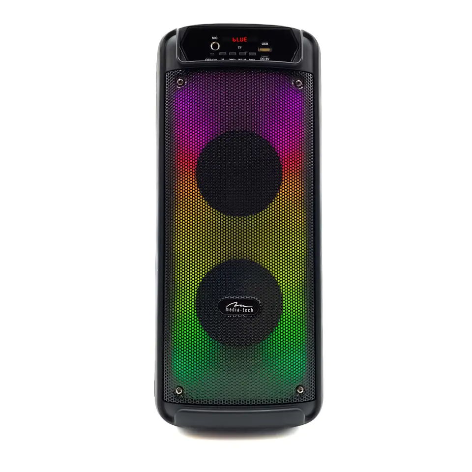 Duży głośnik bezprzewodowy Bluetooth FLAMEBOX UP MT3177 z wielokolorowym podświetleniem RGB/FLAME, radiem FM, odtwarzaczem MP3 z kart pamięci i pendrive. Moc całkowita 14W, 600W.