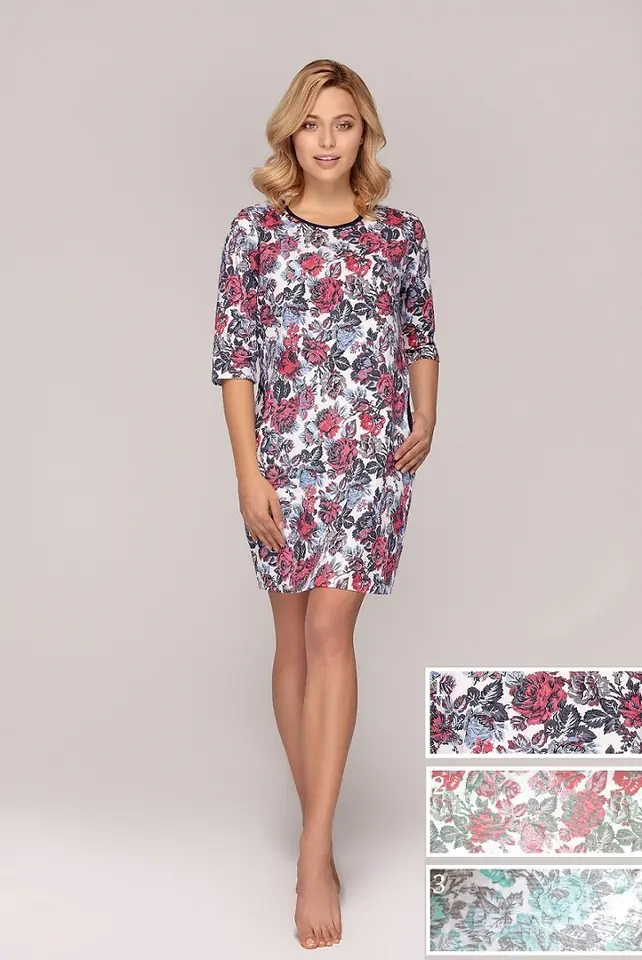 Women's nightgown with 3/4 sleeves made of high quality cotton. Decorated with a subtle print in flowers. Semicircular neckline trimmed with trimming. Knee length. Composition: 100% cotton.