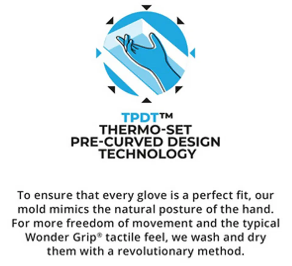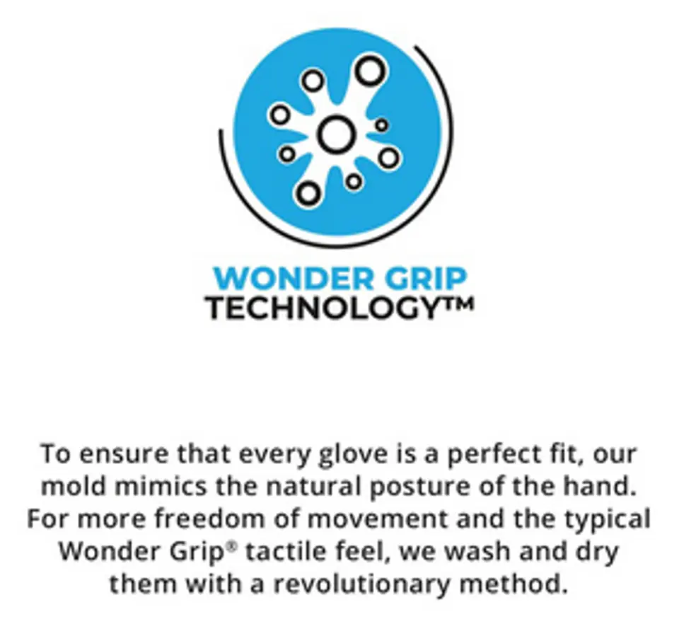 All gloves are manufactured using TPDT (Thermo-set Pre-curved Design Technology). This means placing inside a mold that recreates the natural shape of the hand at rest during soaking, our gloves are also washed and dried by a method specially developed by engineers. This method provides our users with freedom of movement and increased sensitivity, thanks to which Wonder Grip has gained an international reputation. Wonder Grip Technology also provides increased gripping power, thus reducing the risk of injury, preventing musculoskeletal disorders and contributing to additional overall comfort in the workplace.