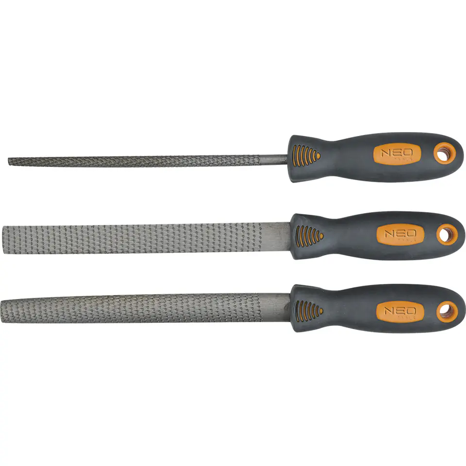The NEO wood file set contains 3 files with lengths of 200 mm each and flat, semicircular and round cross-sections. Designed for grinding wood.
