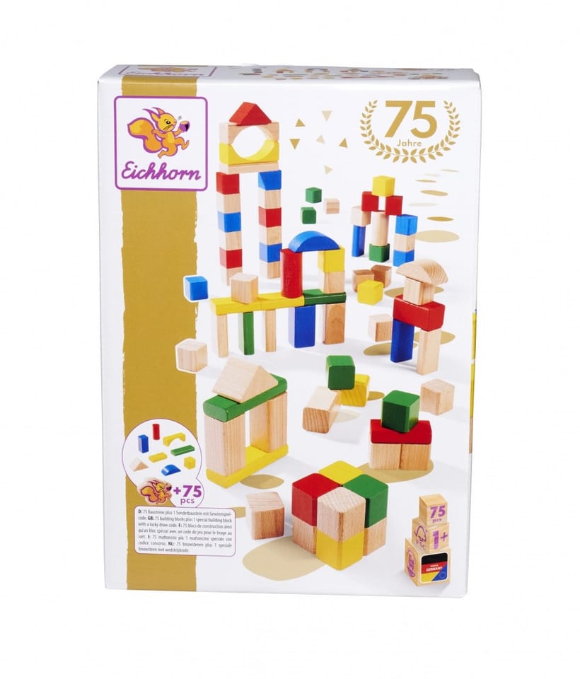 - Anniversary set of 76 wooden blocks for self-construction for the 75th anniversary of the Eichhorn brand, give children from the first year of life the opportunity to create structures according to their own ideas, after playing the blocks can be stored back in the packaging.