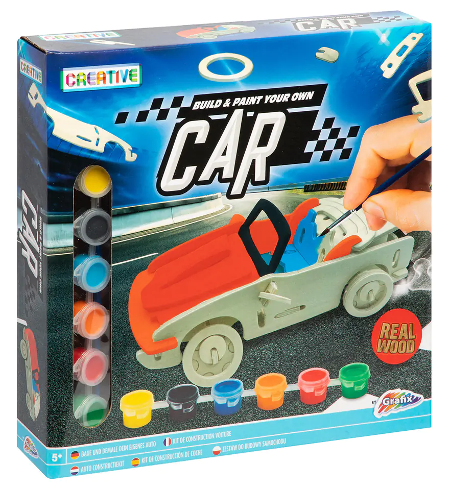 Wooden construction car, 6 paints + brush