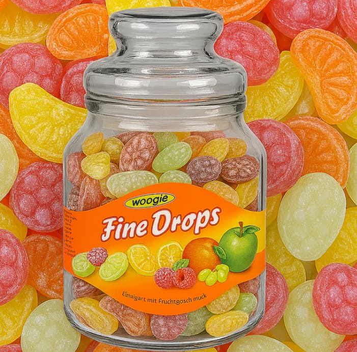 Hard fruit-flavored caramels enclosed in a glass, decorative jar.