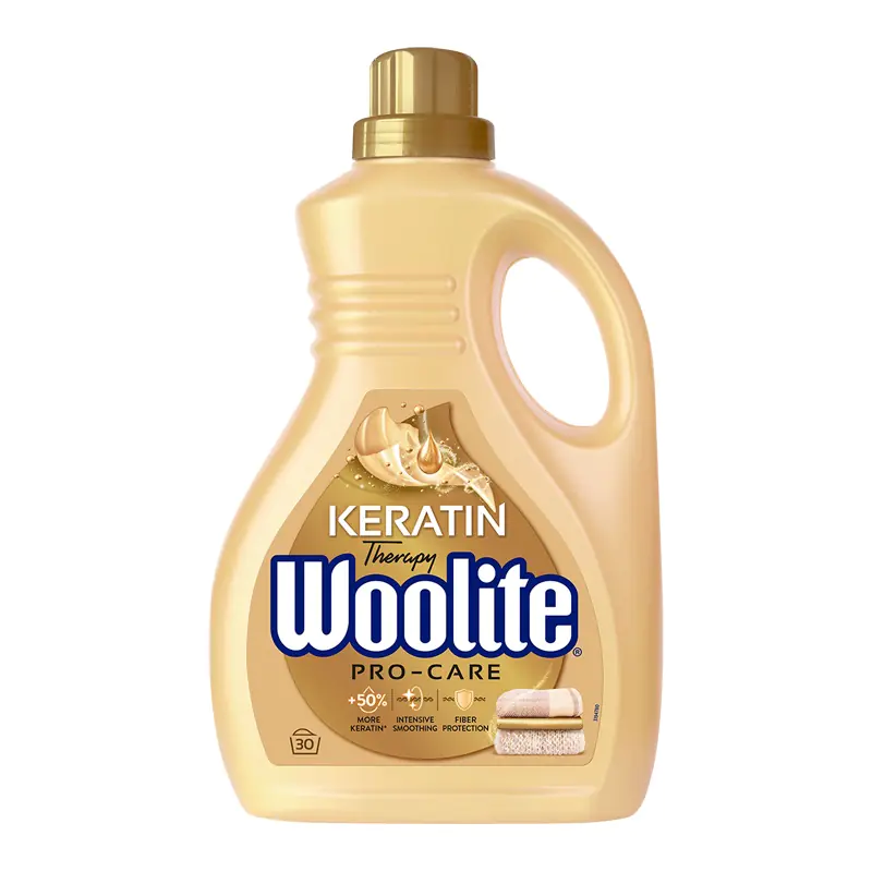 Woolite Pro-Care with keratin keeps fabrics shiny and makes your favorite clothes look like new. In addition, it smoothes the fibers of fabrics.