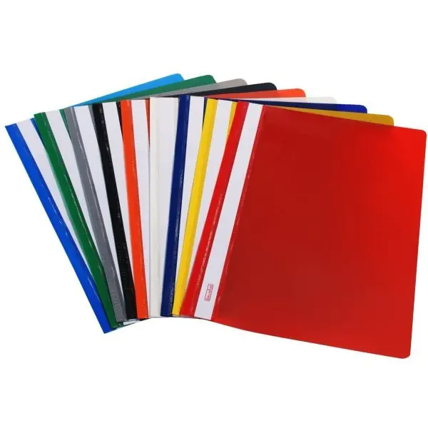 PVC film, front hard transparent, back hard colored; in the middle of the plaque and mustache with a length of 16.5 cm, allowing to attach documents up to 2 cm; replaceable paper strip for description with a bar code for pcs.; two notches for easy pulling out of the strap; rounded corners of both covers; Quantity per carton: 26 packs = 260 pcs.;